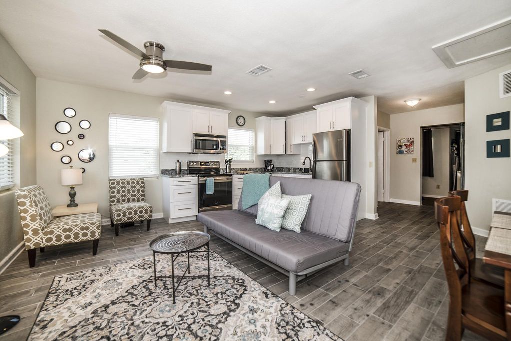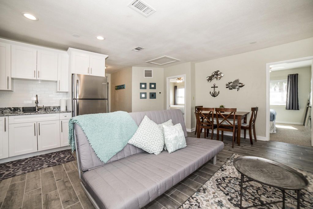 Literally just a few steps to beach access and spanning the entire second floor of the building, this 3bd/1ba unit is newly remodeled and certain to be the perfect backdrop for your vacation with guests and loved ones! As you climb the short flight of stairs to reach the unit, claim your chair and vantage point from your private balcony to witness what are considered to be among the best sunsets in the world! Just inside, Sun Kissed #1 features a very open and airy floor plan. The kitchen, dining room, and living area are all very centrally located and perfect for family gatherings. All rooms are thoughtfully appointed with quality furnishings and our guests top of mind. Features include: