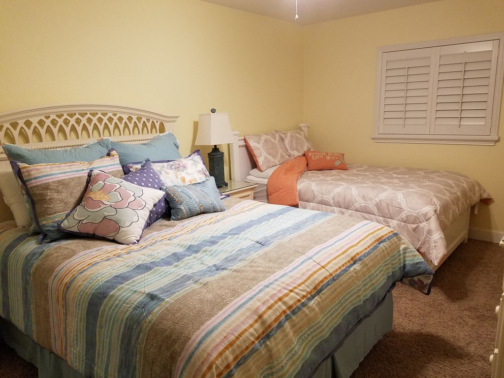 ** Master Bedroom has a King Bed and en suite bathroom with dual vanities and walk in shower. Plenty of closet and drawer storage. Ceiling fan. Sliding glass doors to the balcony allows you a view of the beach while laying in bed. Relax watching the flat screen TV when you need a mid-day nap.
