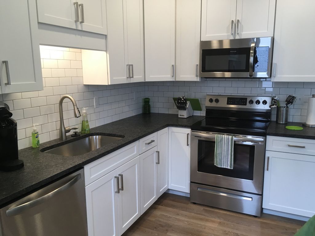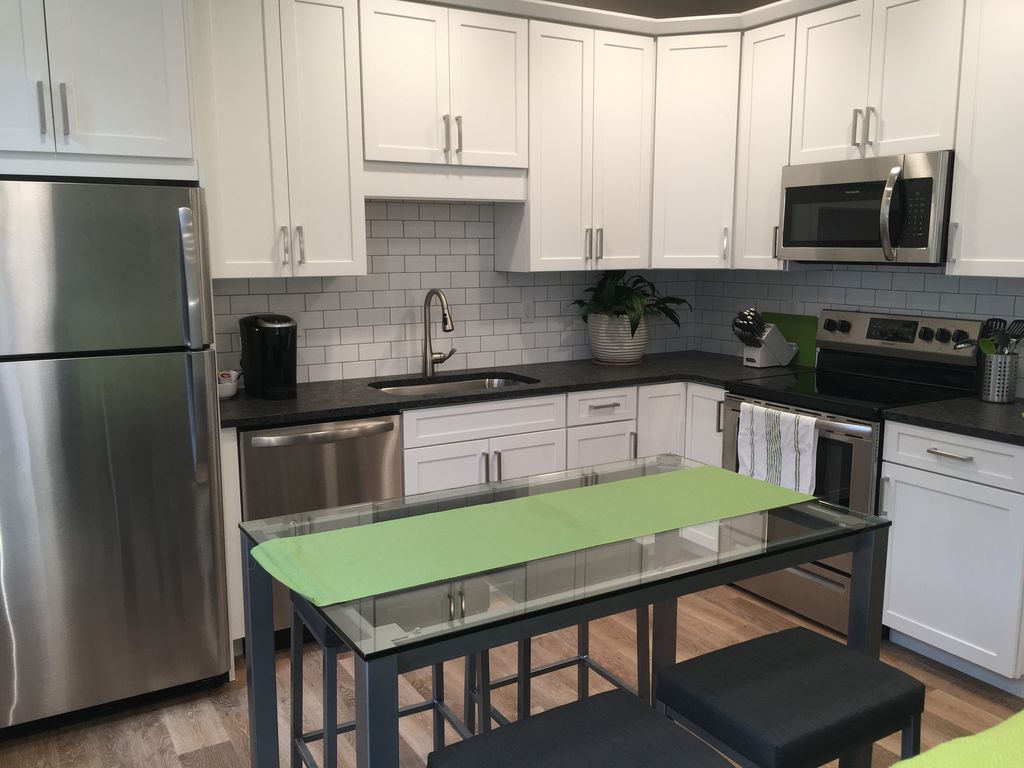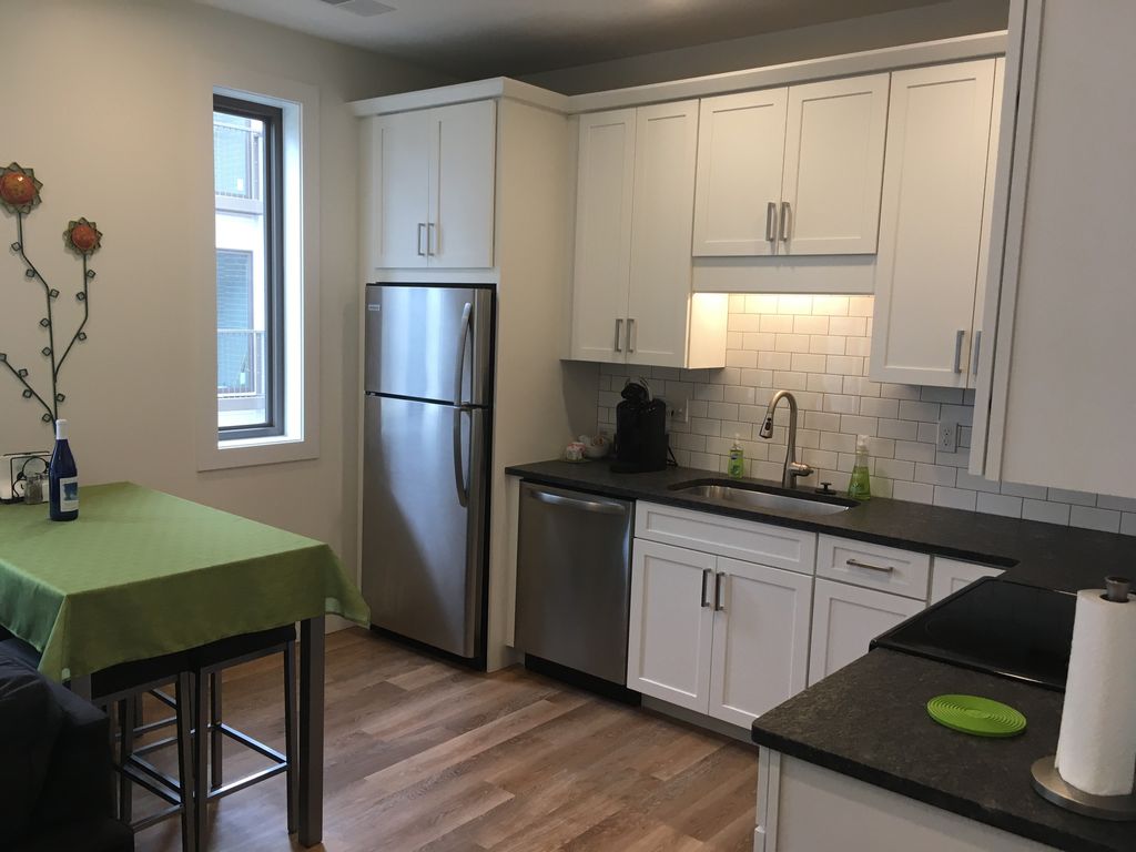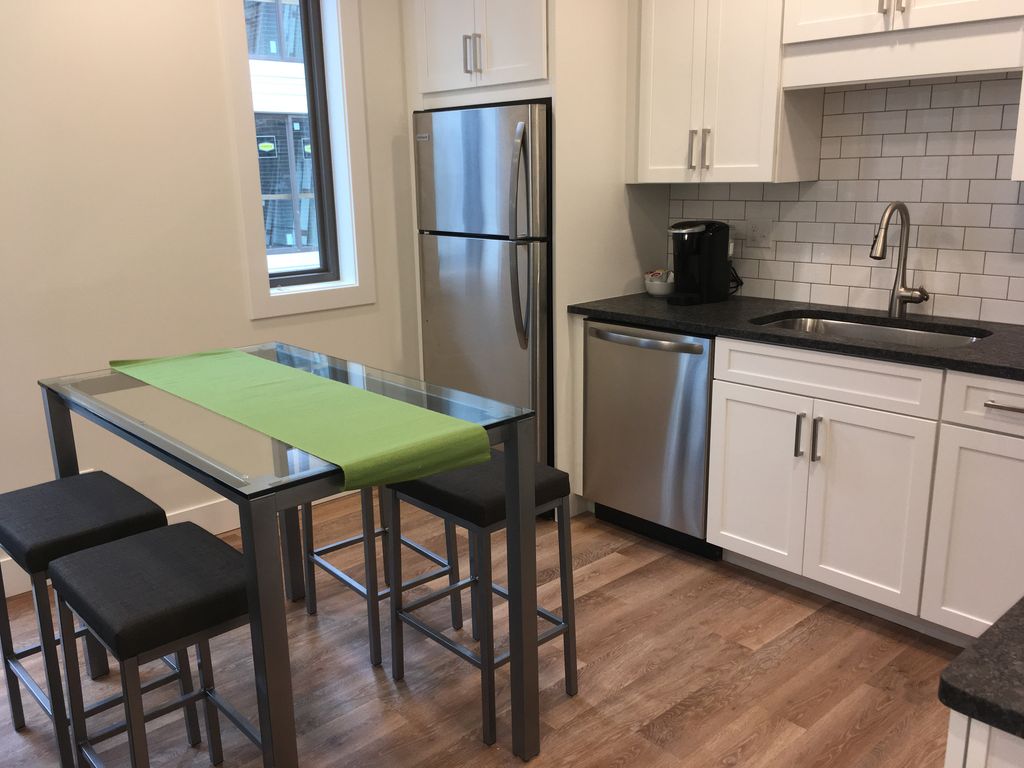9-foot ceilings and a cool white and grey color scheme create a serene and contemporary feeling in a vibrant downtown neighborhood.