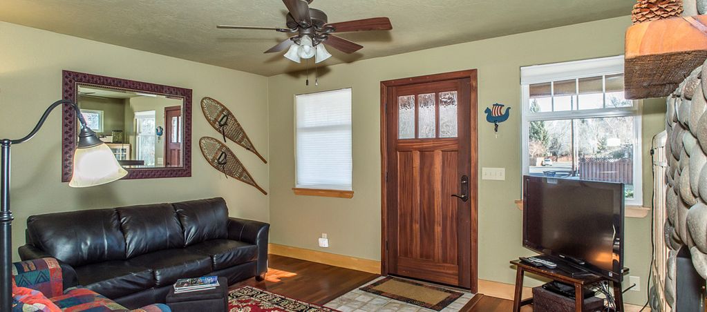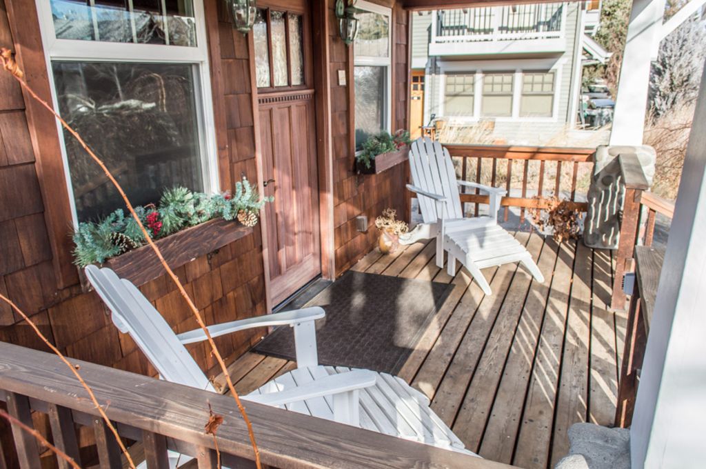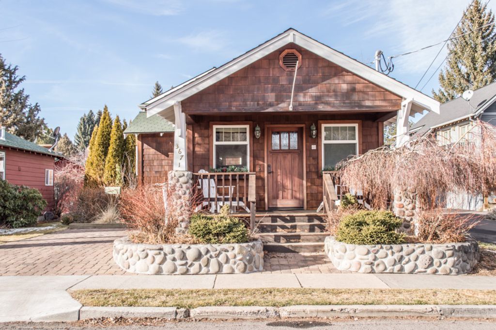 Welcome to our restored Century-Old Craftsman Bungalow on historic Riverfront Street. This one bedroom, one bath has 910 square feet. It can sleep two, possibly three people. You\'ll feel right at home with a fully equipped kitchen, floor to ceiling river rock gas fireplace, inviting front porch with Adirondack chairs and a huge back deck with gas BBQ, dining table and chairs. The Bungalow has Partial River Views as it is considered the \"guest house\" to the larger \"main house\" it shares the lot with. Enjoy easy low bank river access to launch your kayak, canoe or SUP\'s. While you are a guest at Bend Riverfront Bungalow, park your car (private driveway) and experience the best Bend has to offer right out your front door. Our units are situated over three riverfront lots. One common backyard on the waterfront. The bungalow is very close to Drake Park, Miller\'s Landing Riverfront Park a.k.a.The new Whitewater Park, and The Pavilion (Ice skating/sports center) We also have canoes, paddle boards, river float toys and several kayaks (including two kids kayaks) for our guests.