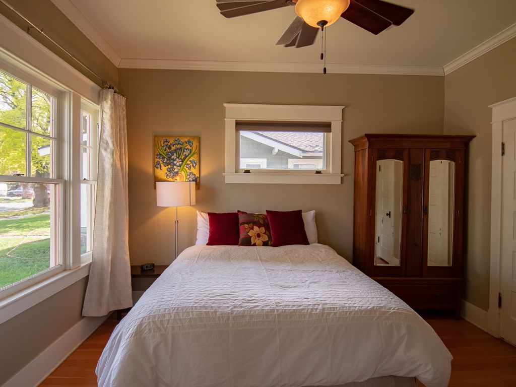 Come stay at our Westside Craftsman Bungalow located in the heart of Bend\'s Historic District. Built in 1919, this home is on the National Historical Register and built for a lumber mill supervisor. We kept the historical elements, but added modern conveniences like central air conditioning & heating, dishwasher and more. Close to all the best that Bend offers but far enough away for quiet enjoyment! Walk to Downtown, Old Mill District, Boneyard and Crux Breweries, Market of Choice, Jackson\'s Corner and more - all within a 5 to 10 minute walk. Bend\'s latest hot spot, The Box Factory, with Immersion Brewing, Atlas Cider, Spoked, Food carts, yoga and summer and winter sports gear rentals is also a 5 minute walk. Enjoy front porch sitting or relax in our large private backyard. You truly get a feel for Bend and its residents in our vibrant neighborhood. Each of the 2 bedrooms has a queen bed with soft sheets and a comforter. The bathroom is large and has a bathtub/shower. Our backyard has lots of grass, BBQ, comfortable seating, great sun and patio umbrella. The backyard is fully enclosed with 6 ft fence making it dog friendly & safe.