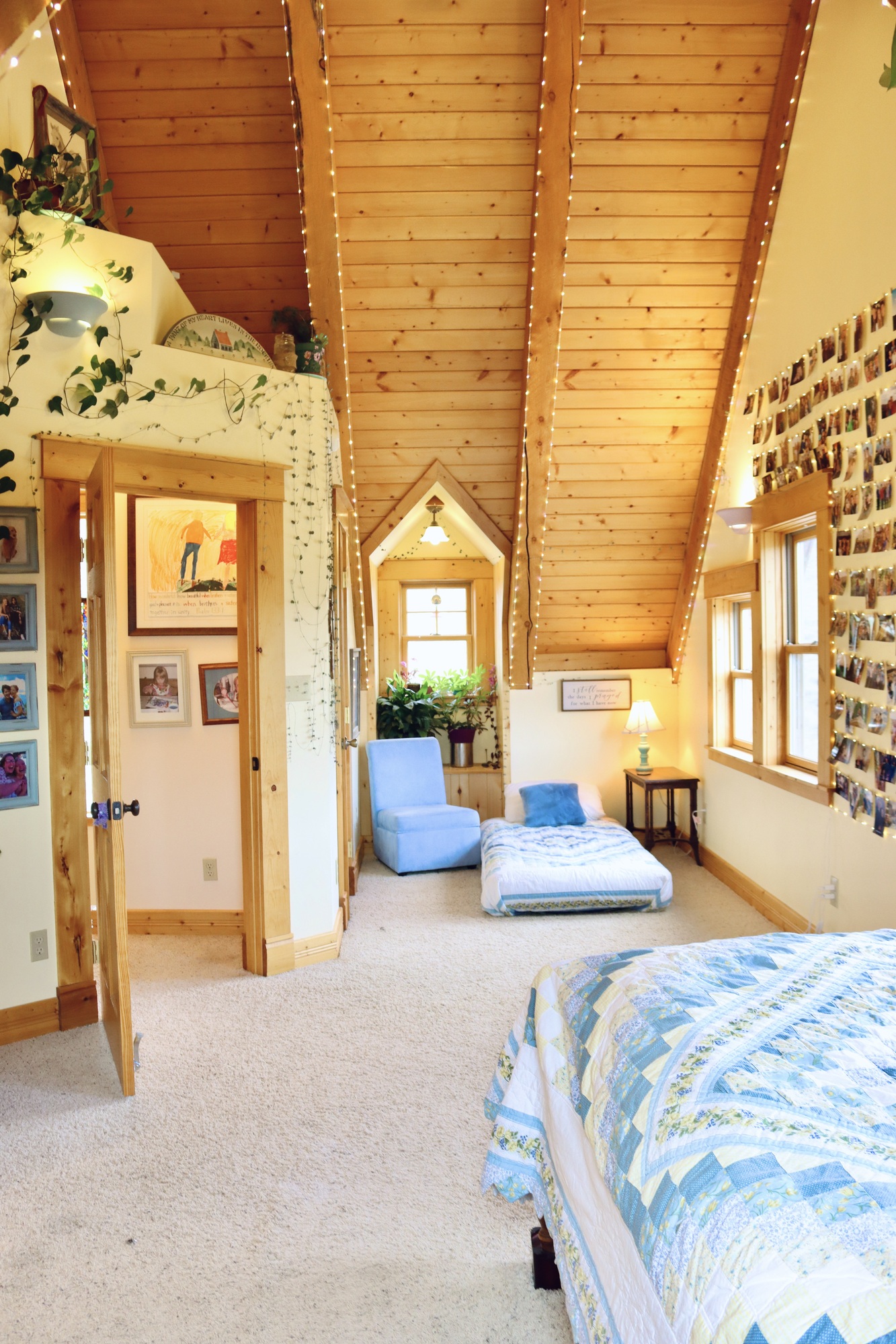 The guest bedroom, located on the main floor of the house, has one king bed and is next to the guest bathroom, which has a full bath and shower. Also on the main floor are the kitchen, and dining area/ living room. Upstairs are two more bedrooms, one of which is the master bedroom. The spacious master bedroom has two queen beds and a bathroom which is equipped with a walk-in shower, bathtub, and large vanity space. Down the hall is another bedroom with a double bed, twin air mattress, and another full bathroom.