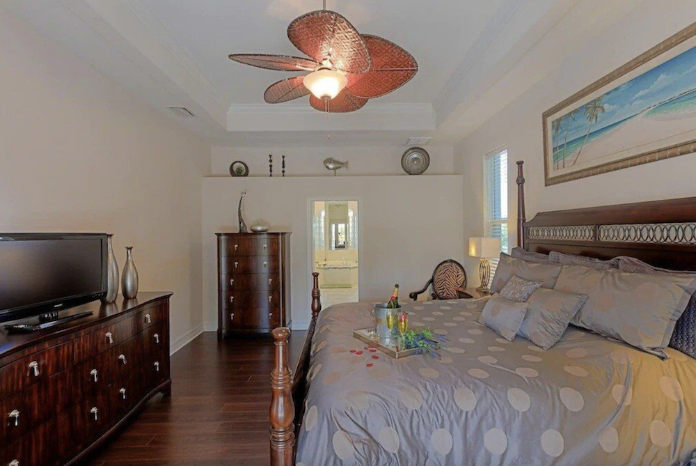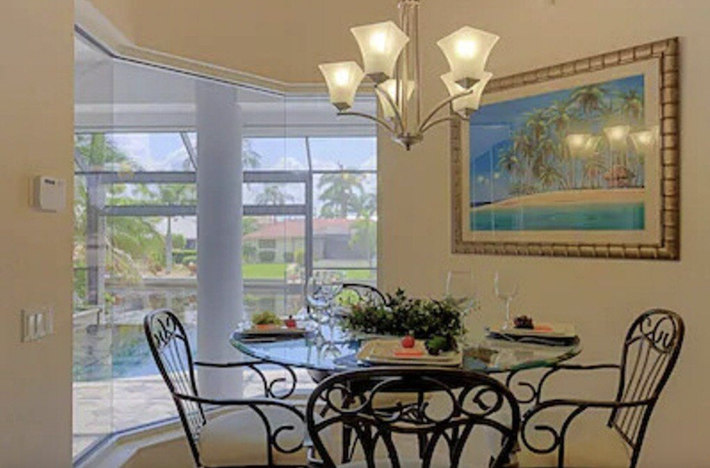 The villa is close to the beach in the yacht club area of Cape Coral. From the villa you can get to Sanibel or Captiva Island very quickly without bridges or locks with a rental boat from a local rental agency. The villa was built in 2009 on an \'over-size\' plot. The a/c living area is 2,540 sqft. Pool area: 1,600 sqft. A 30ft pool with a 16 ft infinty edge and a separate jacuzzi invite you to enjoy the pool or to relax. In the evening, guests can enjoy a romantic cocktail under their tiki hat directly behind the terrace on the boat dock.