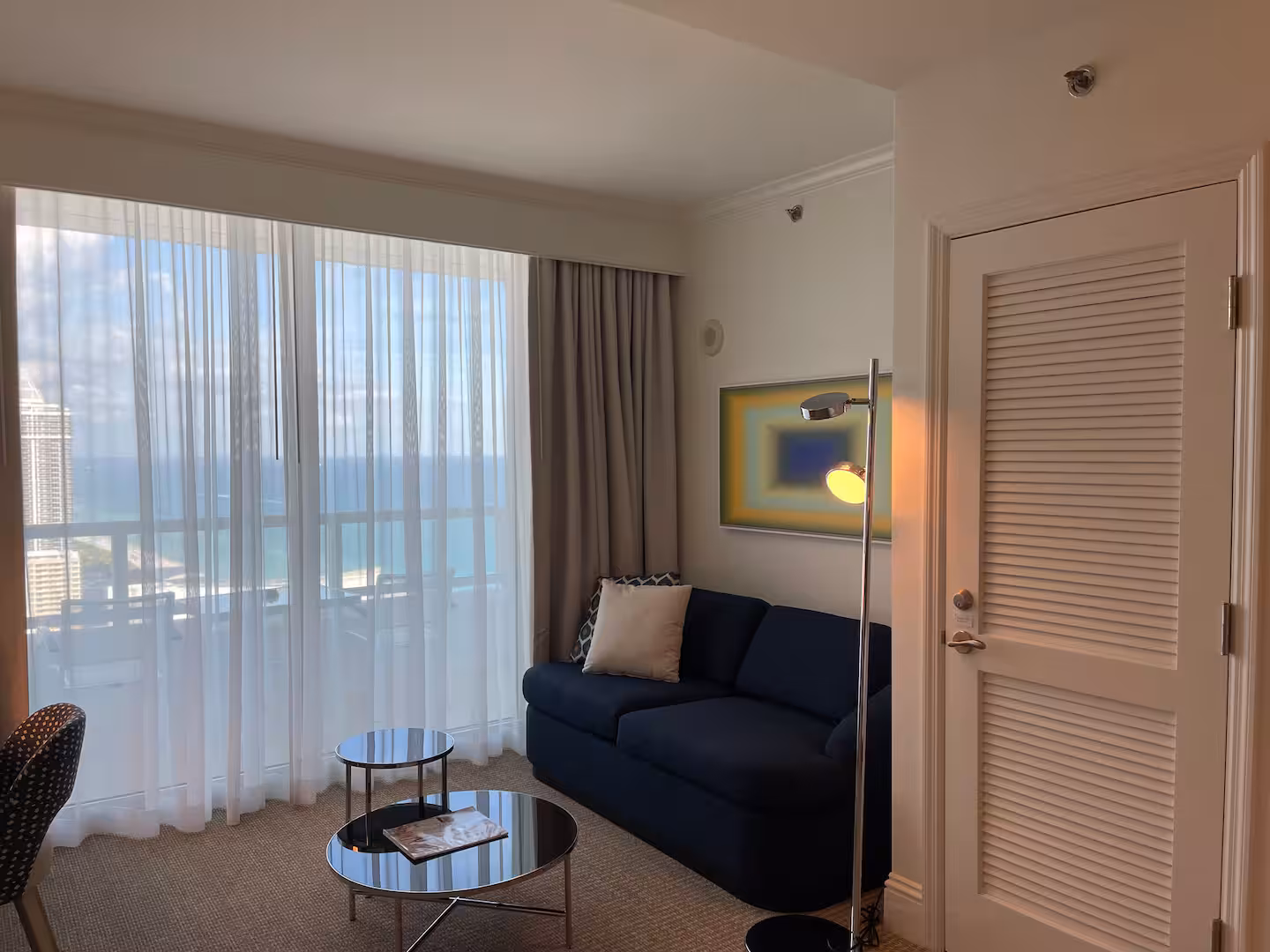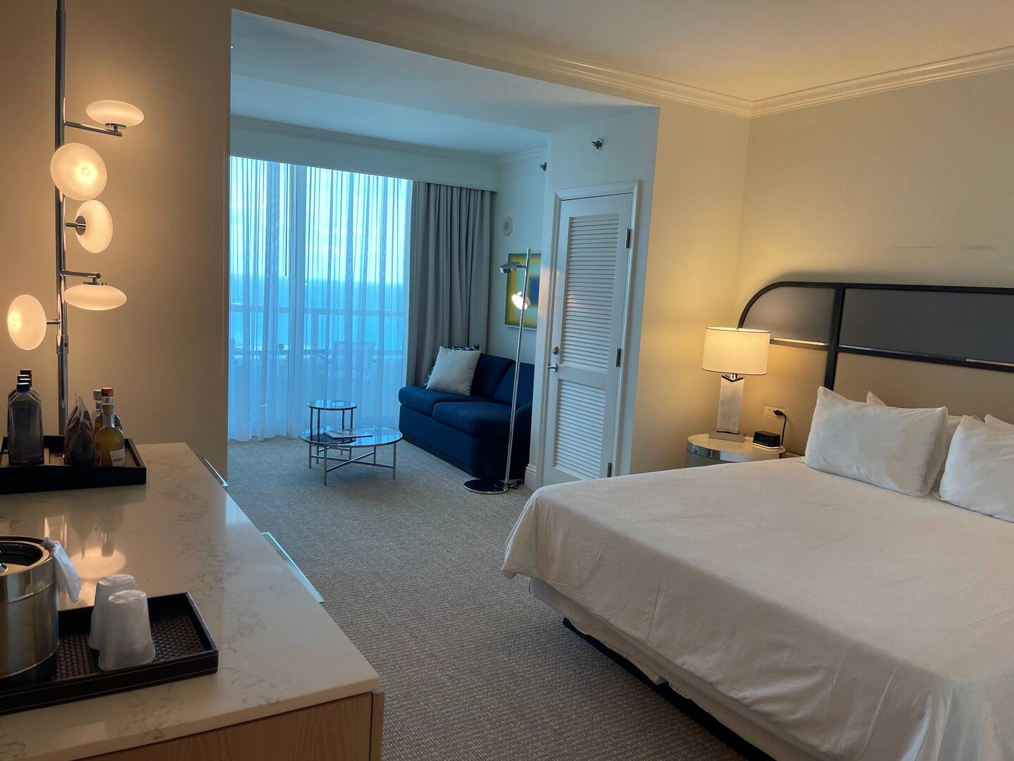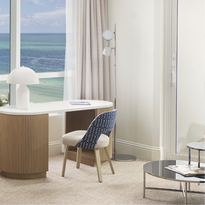 Wake up to a sparkling ocean view from your balcony in Trésor Tower, our 37-story high-rise. Relax or entertain with 500 square feet of comfort featuring a sitting area with full-size sleeper sofa, and kitchenette with mini-refrigerator, sink and microwave.