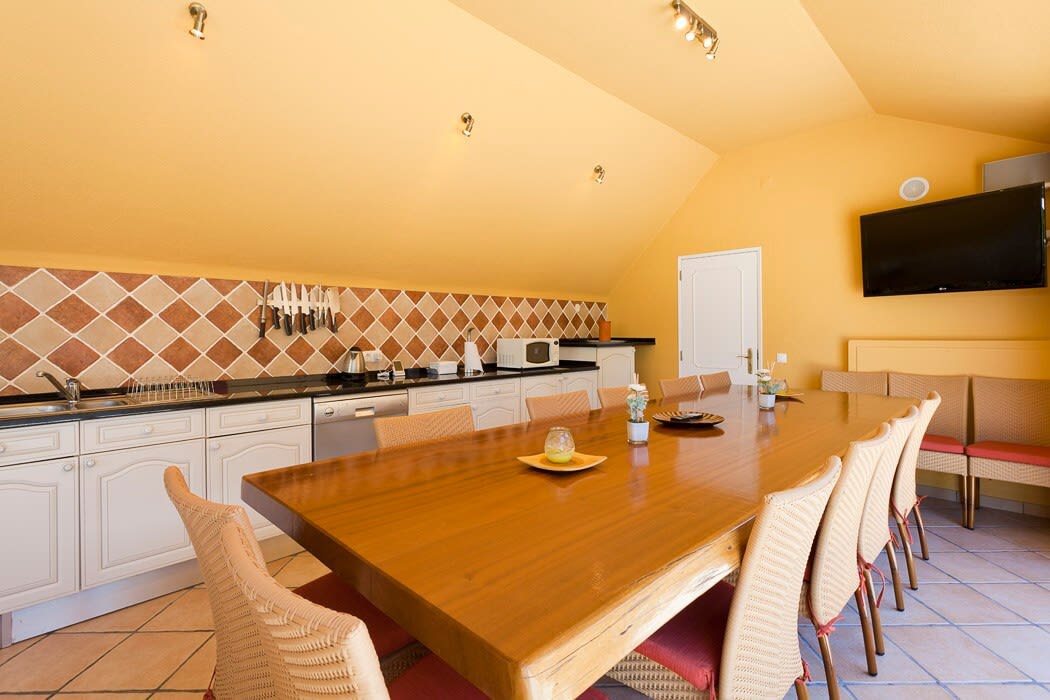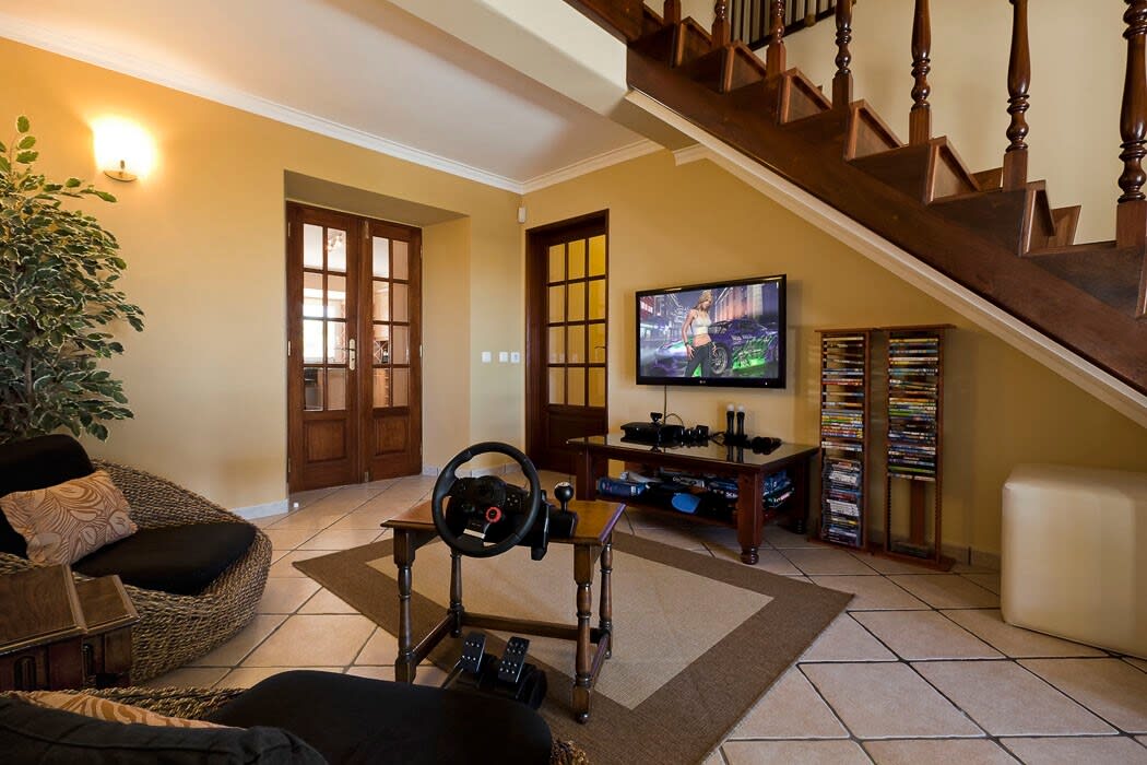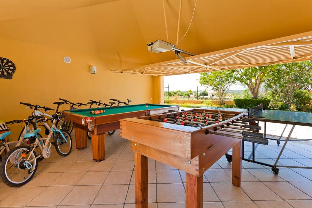 There is also an oven, gas burners, two fridges, dishwasher and cutlery in that area to save carrying back and forth. The house boasts a Sonos music system, with thousands of songs to choose from, as well as many internet radio stations. This music selection can be played in all rooms if so required, as well as the pool area and barbecue. If that is not enough you can stream your own selection from your own playlists directly from you iPhone, iPad or Android device! A full Sky package is available including films and sports as well as cable tv with many english spoken channels. Fibre optic internet delivers a high speed internet connection. In the entrance, there is also an area with a separate tv and playstation 3, with games for all ages, karaoke, etc.,and a selection of board games etc. There are also quite a few books for your reading pleasure. To keep everybody active, we have a pool table, table tennis, football table, darts, football and nets, three adult and three children bicycles, water polo nets, and a trampoline. Additionally there is a outside play area for young children with climbing frame and slides. There is a small herb area, to use at will, some fruit trees, avocado trees and passion fruit growing. Obviously, we cannot guarantee that they will be in season or ripe for eating.