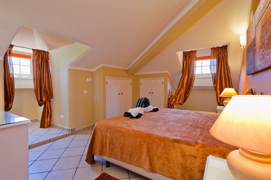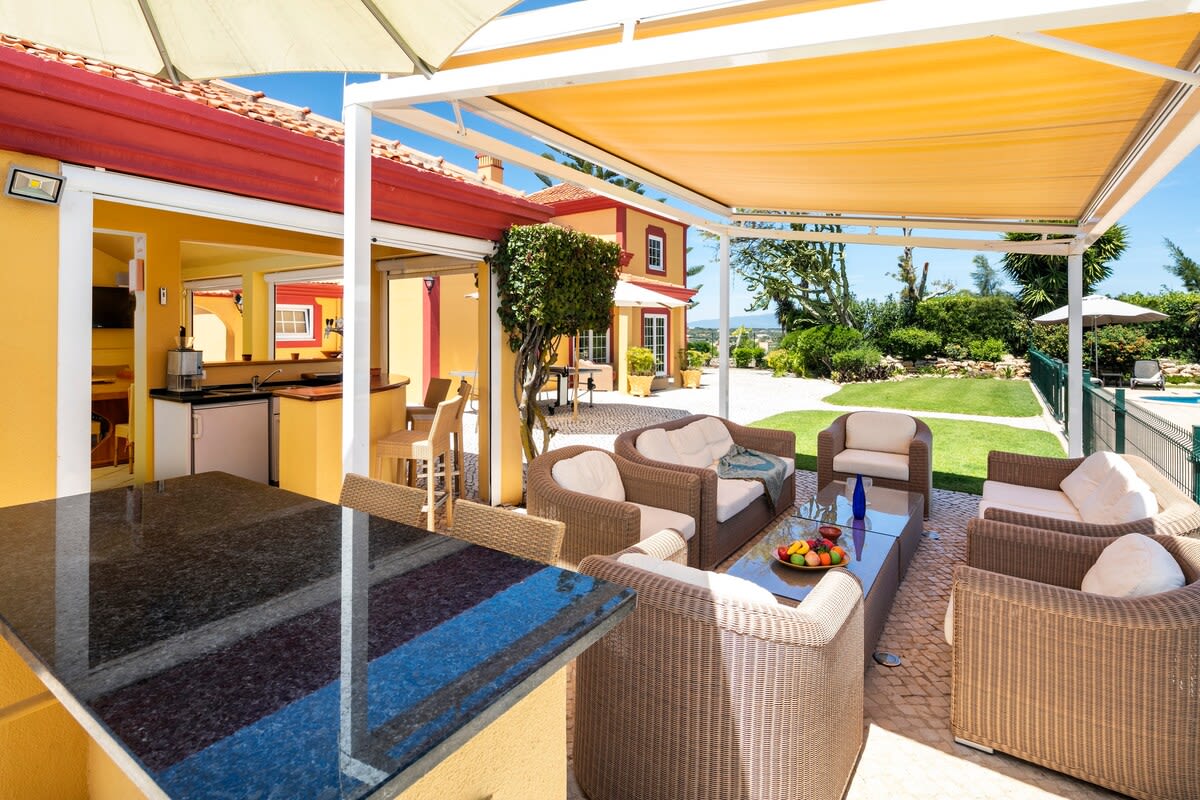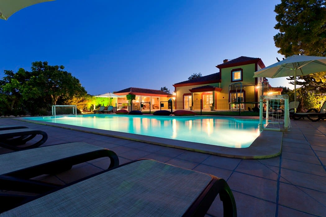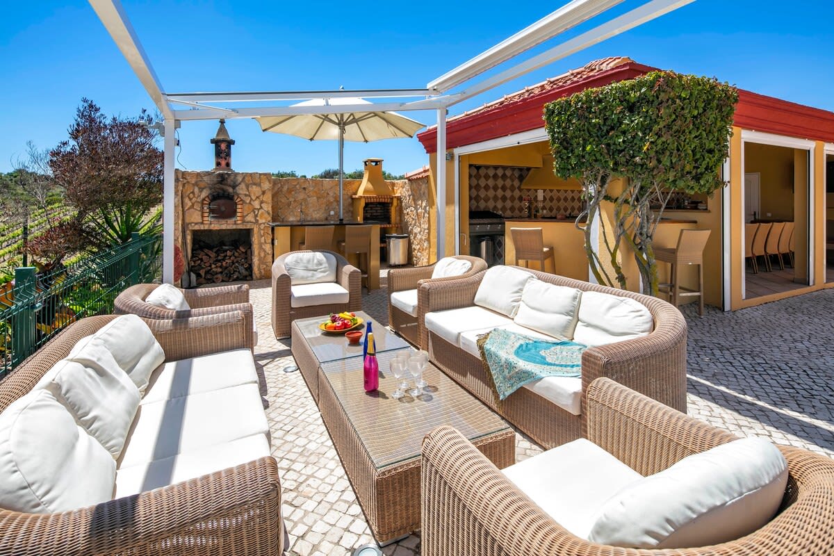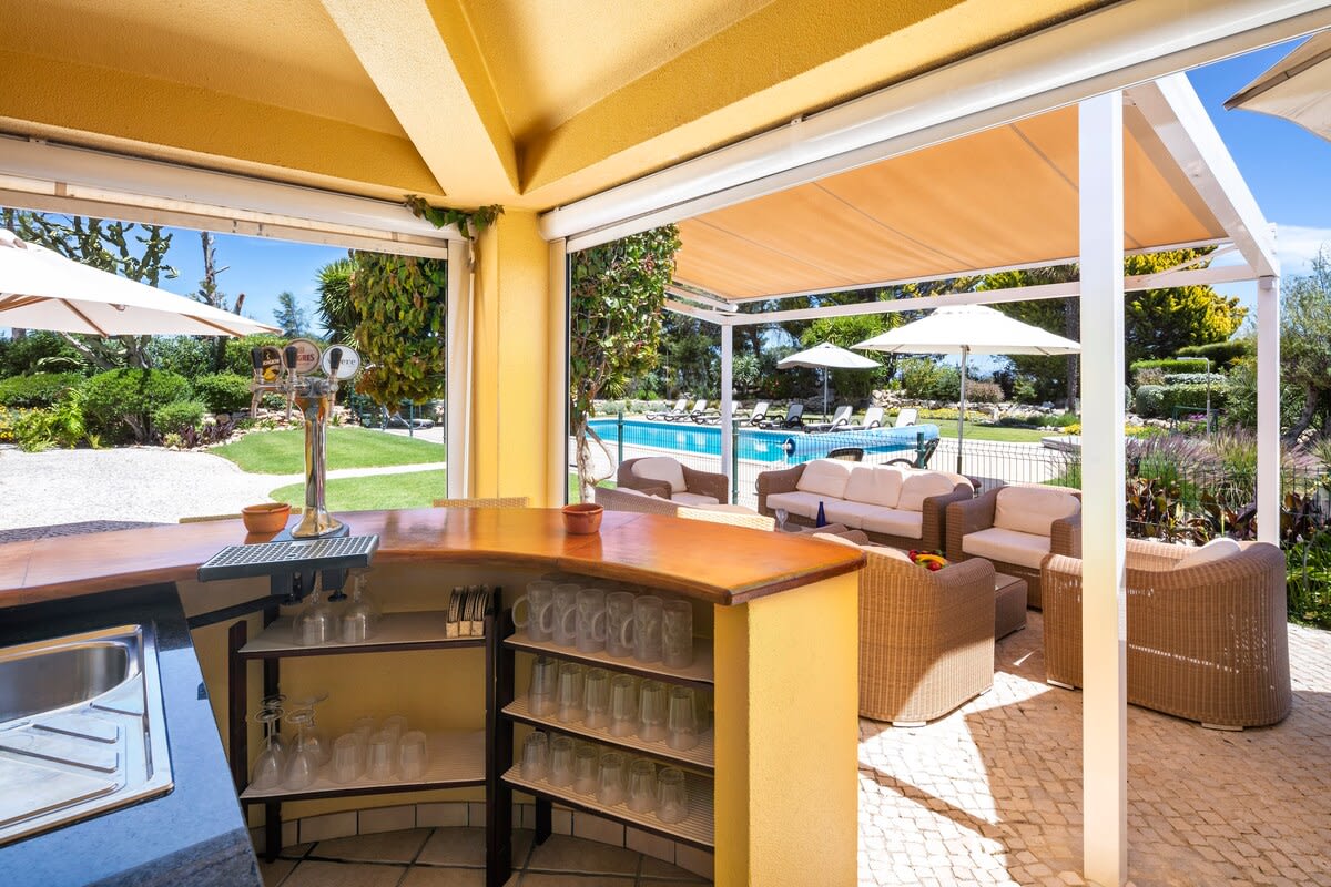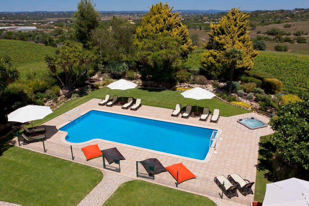The property has six bedrooms, two of which have king sized beds, the others have twin single beds. All bedrooms are en-suite with either single / double showers and/ or bath. Both bedrooms with king-size beds are on the first floor. Wheel chair access is available to one bedroom, with a wet room, special washbasin and toilet (even though you would not notice). The main advantage of the property is that there are various different areas to be. In that way, nobody gets in each others hair!! Cots and high chairs are available at the house. Bedding will be provided, along with face, bath and pool towels.The pool is about 13m x 5.5m. This can be heated, if required, at extra charge of 250 GBP per week. There is a 7 night mimimum charge. An important note is that the pool area is fenced in, thus giving more peace of mind with regards to little ones. There is also an outdoor jacuzzi in the pool area. Free wi-fi is available in the house, plus an additional access point covering, the bar, the barbecue area and some terraced areas, such as the outside sofa area and some parts of the pool terrace. A very popular option with our guests is draught Sagres beer, costing 120 Euros for 50 Litres (approximately 90 pints). We also have Strongbow Cider at 130 Euros for 30 litres and draught white wine at 120 Euros for 30 litres. It is amazing how well these drinks go down in this climate! The beauty of the outside dining/ kitchen area is that it is covered and shaded, a good escape from the sun. There are two barbecues one gas and very easy to use (plus you don\'t get your hands dirty!), or another for the charcoal aficionados as well as a new log pizza/bread oven.