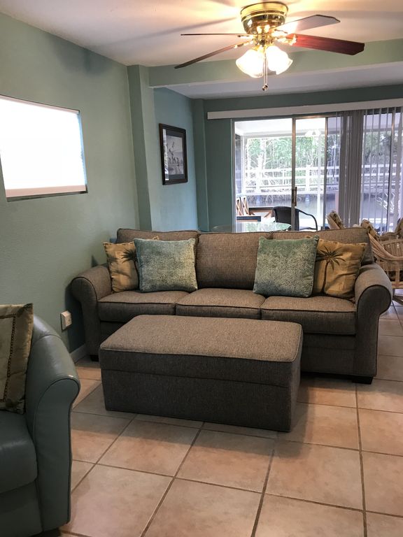 There is a queen size bed in the bedroom and a queen size, memory foam fold out couch in the unit. There is tile throughout. You have several dining options - Enjoy eating at a larger table for 4 inside or the outdoor lanai seating for two. The kitchen has all of the appliances and dishes you will need to make your stay comfortable. There is a 50-inch smart cable TV with a DVD player for your enjoyment.