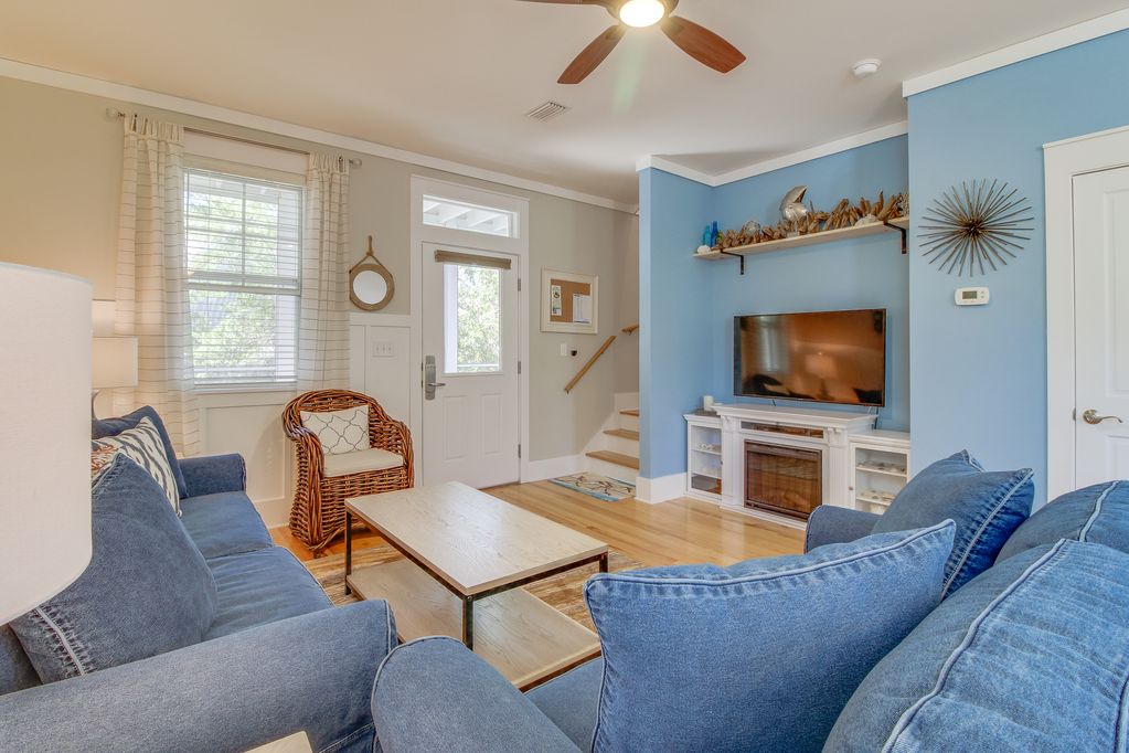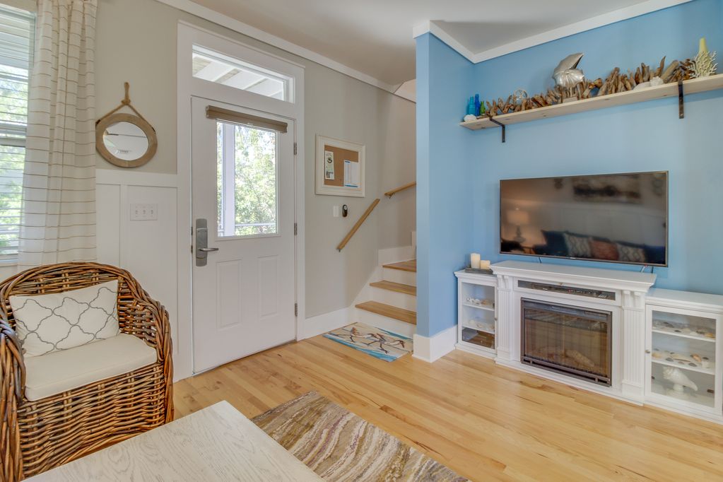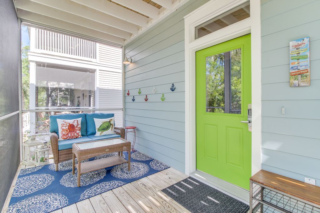 Step past the charming sitting area on the porch, through the green door, and into the bright and cheery main living area. The casual, beachy vibe beckons you to lounge on the soft blue couches while you check out what\'s on cable on the flatscreen TV.