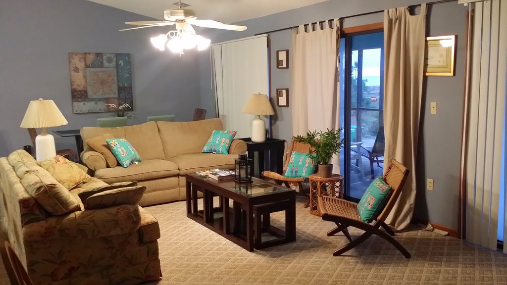 The three bedroom home has a 60 foot long screened in Porch perfect for viewing the Gulf facing frontage with access through two bedrooms and the family area. There are five sliding glass doors providing entry to the enclosed porch and Gulf view. You can quietly listen to soothing waves as they caress the white sandy beach for miles. This area is perfect for families,kids of all ages and is pet friendly.