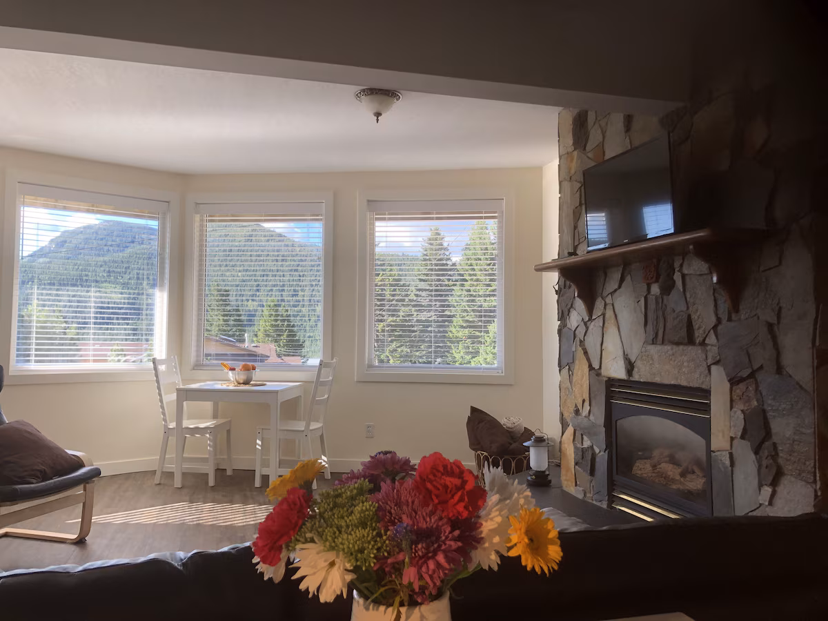 Located on the side of a mountain, our two bedroom suite has a beautiful view and has easy access. The open concept suite is newly renovated with a full kitchen, living room and two bedrooms . You can relax and curl up next to the fireplace and enjoy your day inside, or you can head out to enjoy the mountains, rivers and lakes all around you! To see the whole area you can take a 20 minute hike from behind our house up to the top of the mountain! This area is full of adventure and fun for the whole family!