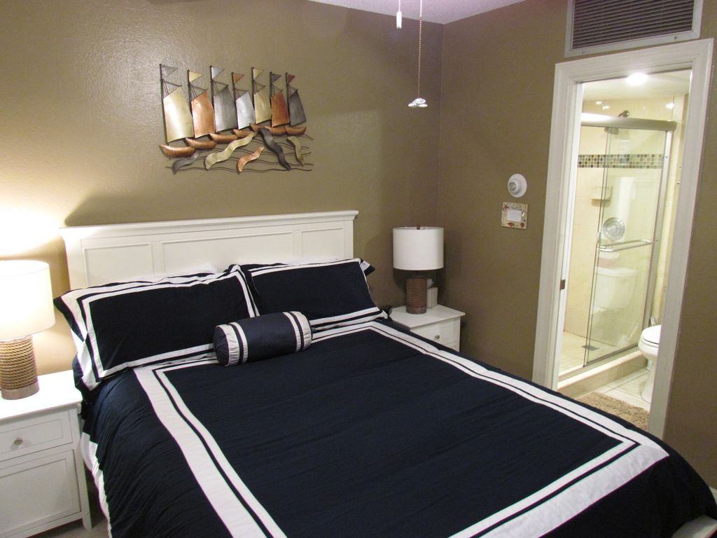 The condo has a queen in the bedroom and full size sleeper sofa in the living room and an updated bathroom with walk in shower!