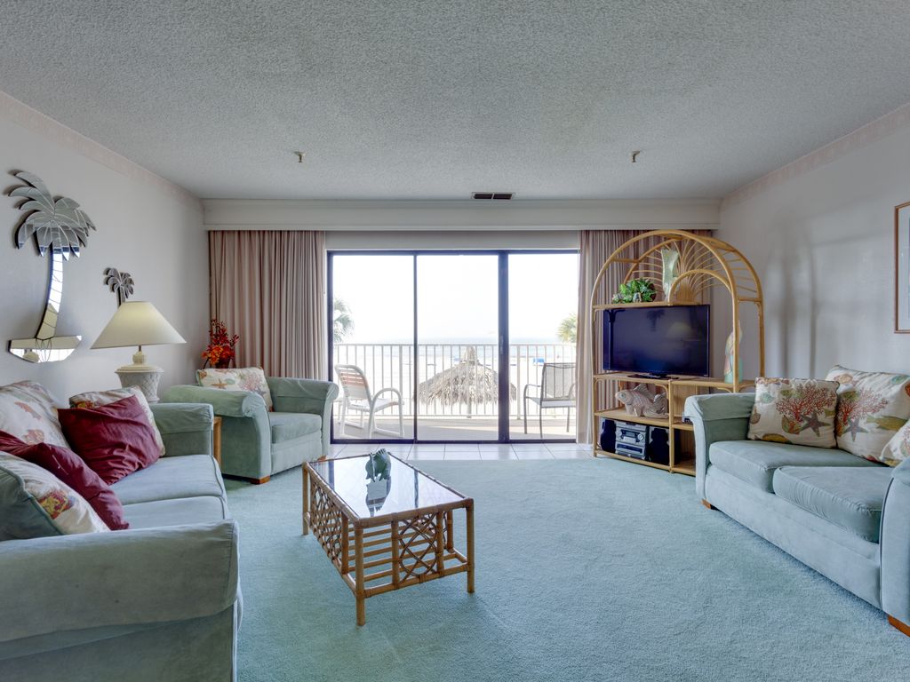Beautiful 1 bedroom, 1 bathroom direct Gulf Front unit on the 1st floor. This 1 bedroom unit features a queen bed with a flat screen TV. The living room has a queen sofa sleeper along with a flat screen TV.