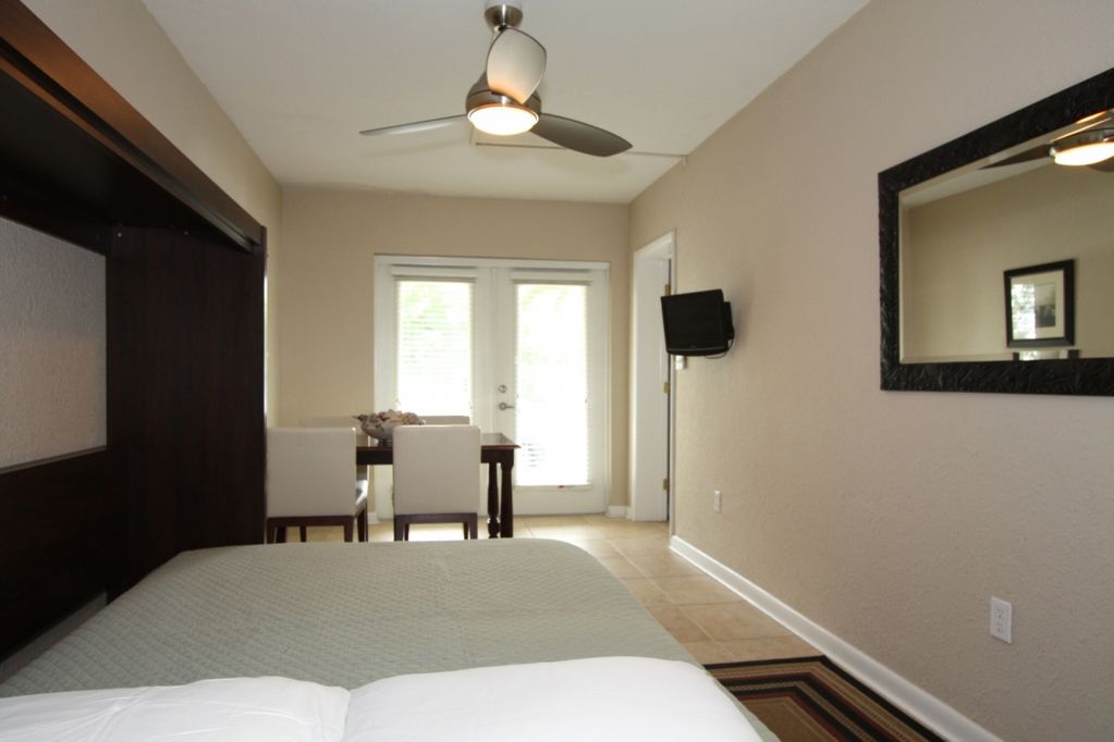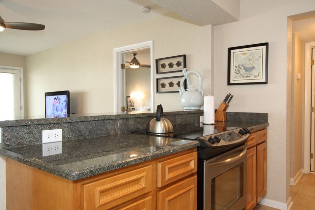 The entire condo has been updated with tile and wood floor, granite counter-tops, and stainless appliances. The large private master bedroom features a comfortable Queen-size TempurPedic bed, and the second bedroom sleeps additional guests with a comfortable \"Murphy\" style Full-size bed which can be folded away for additional space. The living room and private Gulf-facing patio give a beautiful view of the water and the Sunset over the Gulf, and the large couch is generously big enough for a nap after a long day on the beach.