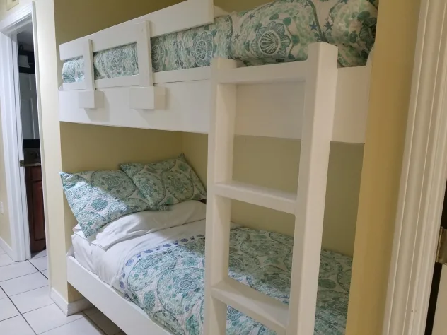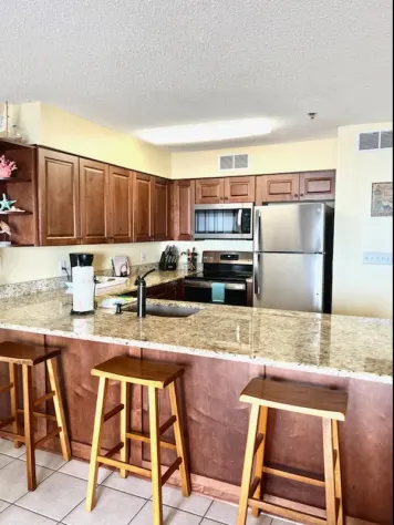 My husband and I stayed for a week, and we enjoyed it so much. The location is convenient to everything, and we so enjoyed being able to walk out the door and be at the beach in 15 seconds! The bathroom is like a Jack and Jill type bathroom. It\'s a pretty tight area, and if we were obese people, it would have been uncomfortable. The bed in the master is a memory foam bed. It wasn\'t the worst bed I\'ve had to sleep on, but it wasn\'t the best either. It is bigger than the foundation it sits on, so it hangs over on the sides which was kind of weird. Then we both slid toward the middle until we were right again each other. Again not completely terrible, but not great either. The kitchen is very nice and well stocked with pots, pans, utensils, and most anything you would need to cook a meal. There isn\'t a shelf in the freezer, and the ice maker was turned off. We turned it back on, and it worked fine, but the bucket sits so low that it is loud when it drops and it will overflow because it doesn\'t know when it\'s full because of the missing shelf. I was happy to find a vacuum cleaner in the closet for cleaning up the sand that gets tracked in. The washer and dryer are tiny, but work fine. Tami was very responsive and easy to work with. Overall we loved our time spent at the condo and would stay again without hesitation!