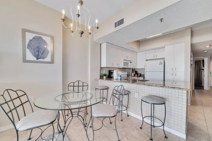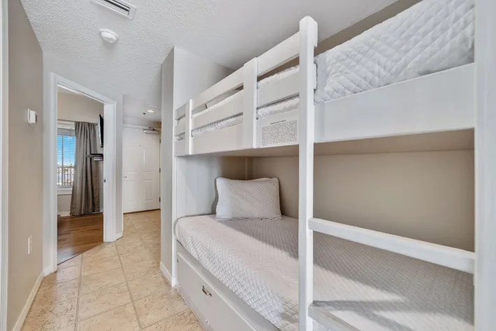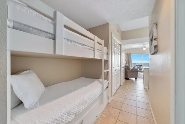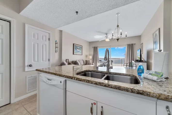 As you enter Tidewater 505, the one bedroom is immediately to your right. This bedroom features a queen-sized bed, wall mounted flat screen tv, closet and direct access to the shared bathroom. This bathroom has a tub/shower combo. In the hallway, there are built-in twin sized bunk beds. There is also a washer dryer combo for added convenience. Continuing inside, you have a full kitchen stocked with all of the needed essentials to prepare a meal should you decide to stay in. There is a table with seating for three and additional seating for three at the bar. Enjoy your meals while taking in the stunning views through the sliding glass doors. In the living room area, there is comfortable seating (sleeper sofa) for down time to watch the flat screen tv. Or step out onto your private balcony, featuring a table with seating for four, and breathe in the fresh salt air while listening to the waves crash along the shoreline.
