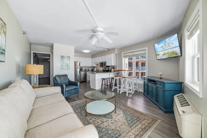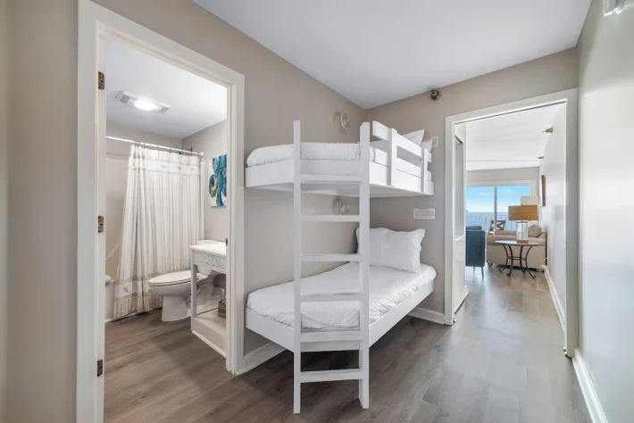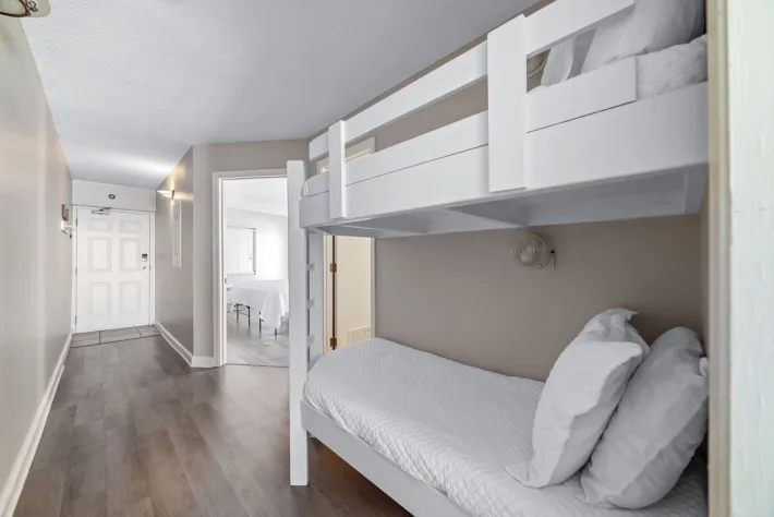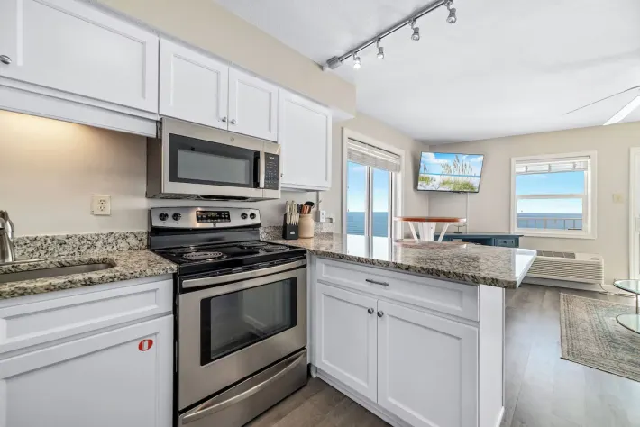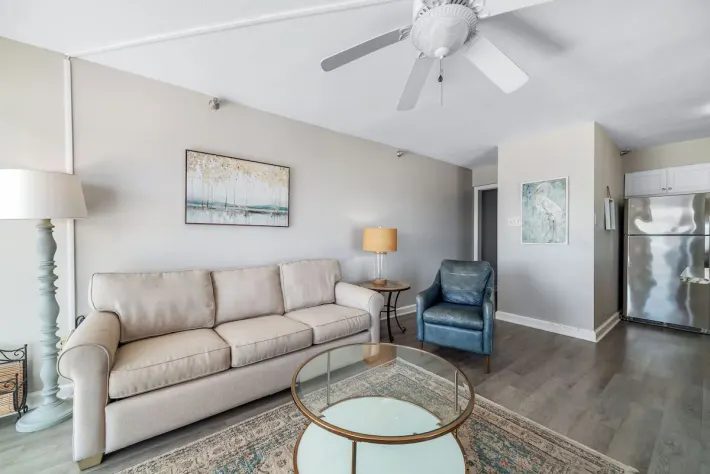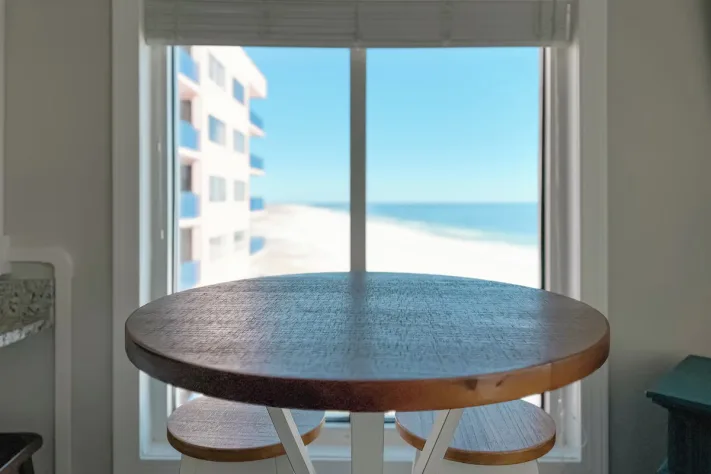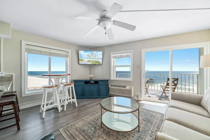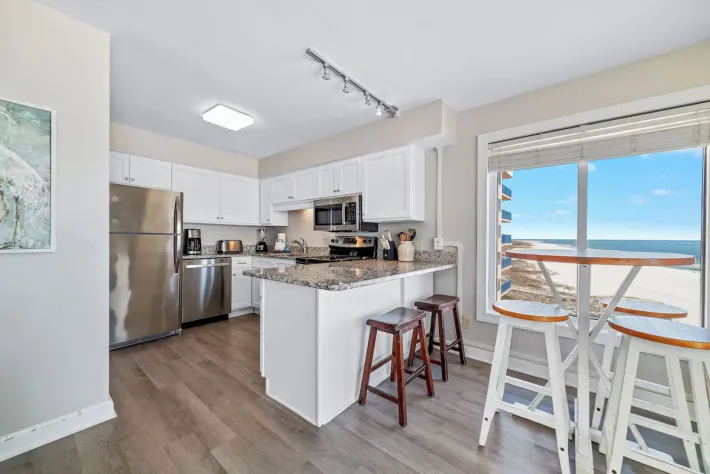 Just inside and to your left is the bedroom, featuring a king-sized bed, wall mounted flat screen tv and gulf views. In the hallway, is the bathroom with a shower/tub combo. Also nestled in the hallway are built-in bunkbeds. As you pass through the hallway and enter the open floor plan, you are able to take in beautiful views of the gulf and shoreline. The full kitchen is updated with all stainless-steel appliances and is stocked with cooking essentials needed to prepare basic meals. The living room features a large wall-mounted tv, sofa sleeper and a relaxing chair with the perfect view out onto the balcony. The dining nook has a high-top table with seating for 3 and there is additional seating for two at the bar.