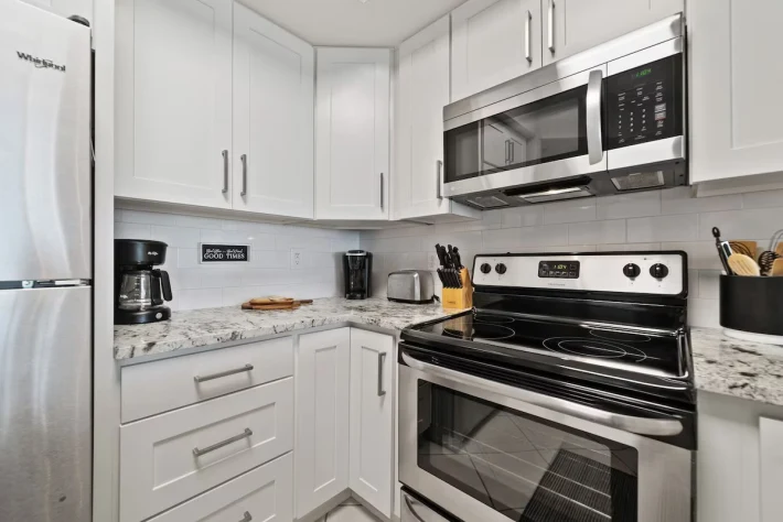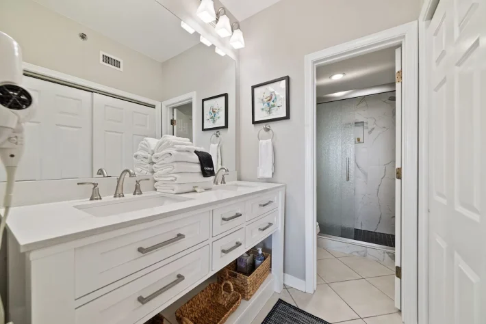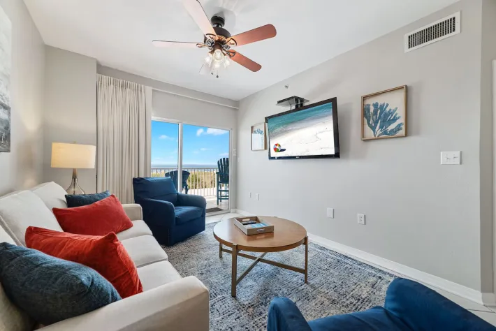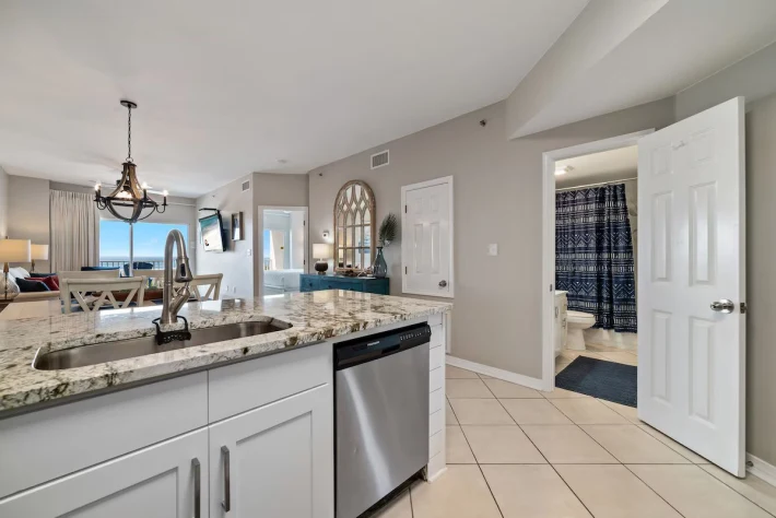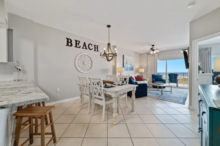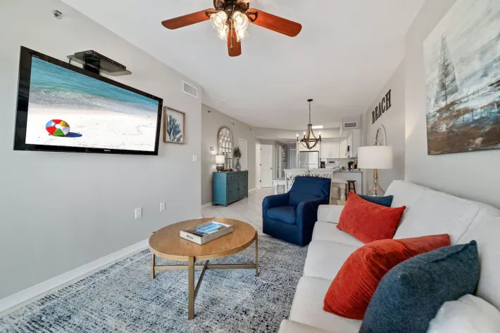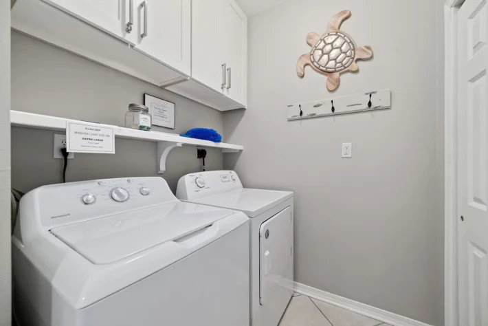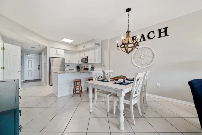 As you enter the condo, you are greeted by the burst of sunshine coming in from the balcony! Immediately to your right is the first of two bedrooms with a king-sized bed, flat screen tv, closet space and direct access to the shared guest bath. Also off of the entry way is the full laundry room with a washer and dryer for added convenience during your stay. Continuing inside, you make your way into the full kitchen stocked with all of the cooking essentials needed should you want to stay in and cook a fresh meal. A dining area that will seat 4 at the table and 3 at the bar. Comfortable seating (with sleeper sofa) in the living room area to enjoy your down time watching the wall-mounted flat screen tv or taking in the views through the sliding glass balcony doors. Off of the living room is the main bedroom. This bedroom also has a king-sized bed, flat screen tv, closet space and beautiful en suite bathroom featuring double sinks and tiled walk-in shower. This main bedroom has direct access onto your balcony. The balcony is furnished with a high-top table and 4 chairs along with 2 additional chairs and table. The perfect spot to begin and end every day of your stay!