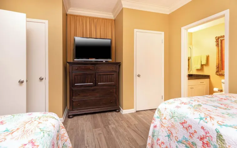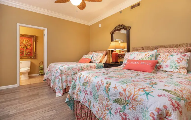 As you enter the condo, the guest bedroom is off of the entry to your left. This bedroom is comfortably furnished with two full sized beds and features a full en suite bathroom. Continuing into the condo, the open floor plan provides plenty of room for relaxing indoors or spending time together preparing meals in the full-sized kitchen, stocked with the basic essentials for cooking. Off of the living room is the main bedroom furnished with a king-sized bed and also has access onto the balcony. The main bedroom has a full en suite bathroom.