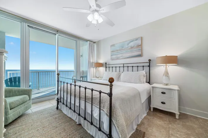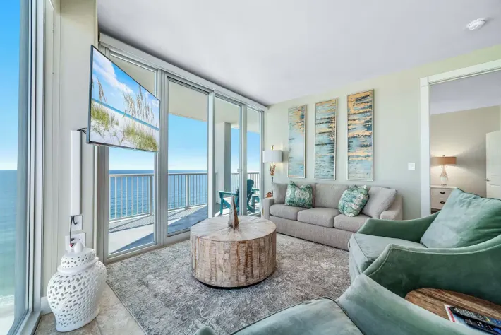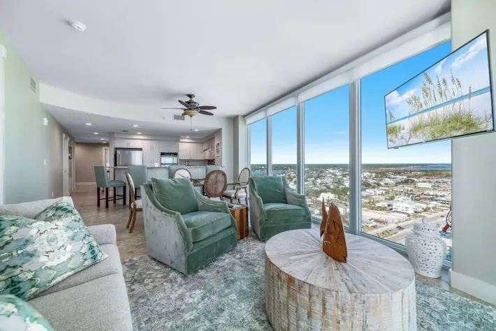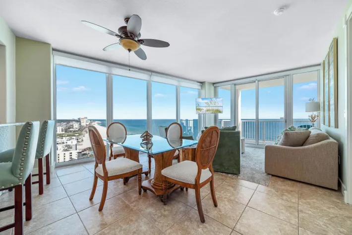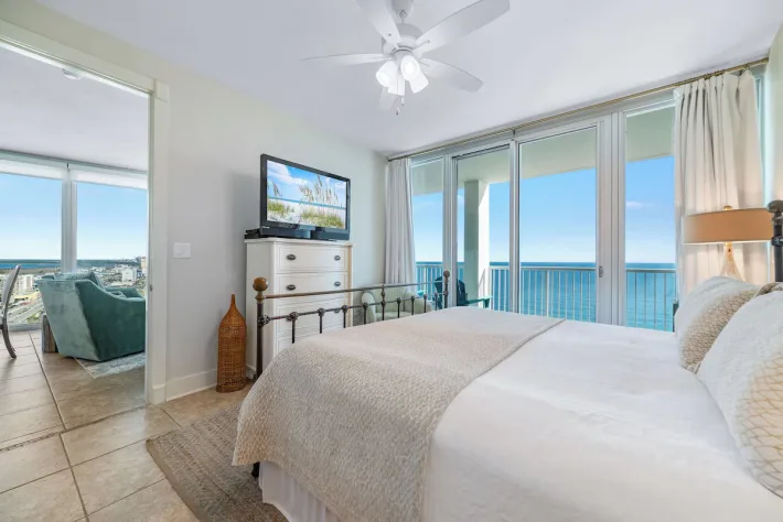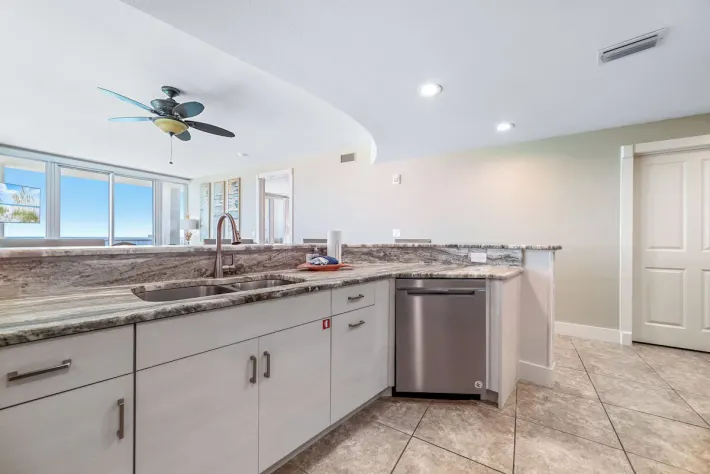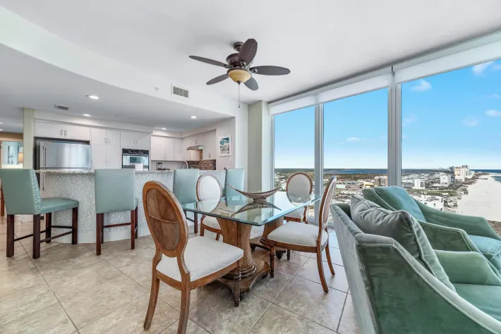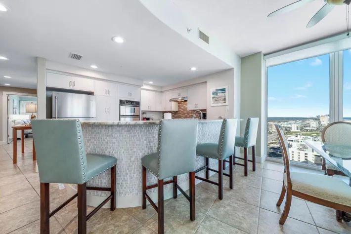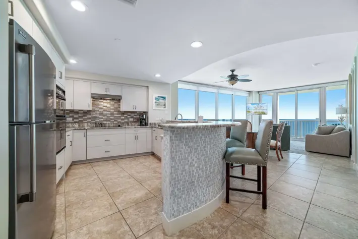 As you make your way into the kitchen and living area, you will be drawn in by the floor to ceiling views of sandy white beaches and the Gulf of Mexico. Even though you are on vacation, you will want to spend some time in this beautiful kitchen with white cabinets, marble countertops and stainless-steel appliances. Your views while preparing a meal in this fully stocked kitchen with be truly breathtaking.