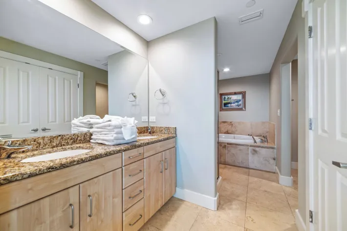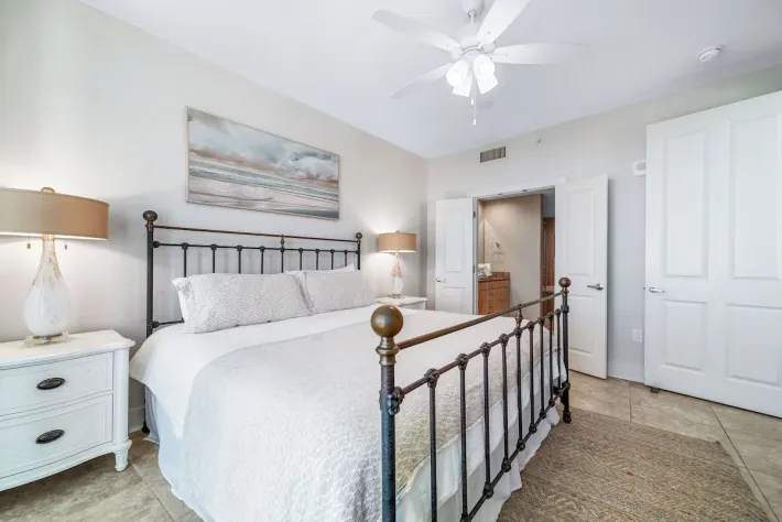 Watch the sunrise and sunset from the comfort of the living room or step outside to smell the fresh salt air and listen to the waves crash onto the beautiful sandy white shoreline. Just off of the living area is the main bedroom, featuring a king size bed, Smart TV, closet space and ensuite bath with a walk-in shower and separate tub. You will also have access to the main balcony from the main bedroom. The perfect spot to enjoy your morning coffee in pure serenity.