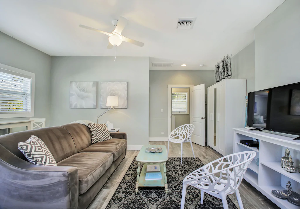 The Sedgwick cottage has a full kitchen with farmhouse sink, gorgeous Quartz countertops and stainless steel appliances, with wonderful peeks of the Gulf through just about every window, as well as from your private deck landing. New, wood-grained ceramic tile floors throughout. The bedroom is brightly lit and has a Queen sized bed, flat screen TV, and plenty of storage space. The living room has a Queen sleeper sofa for additional guests. This cottage will sleep 4 - maximum number of guests is 4. The bathroom is nice & large with a bathtub/shower combination. Parking on site.
