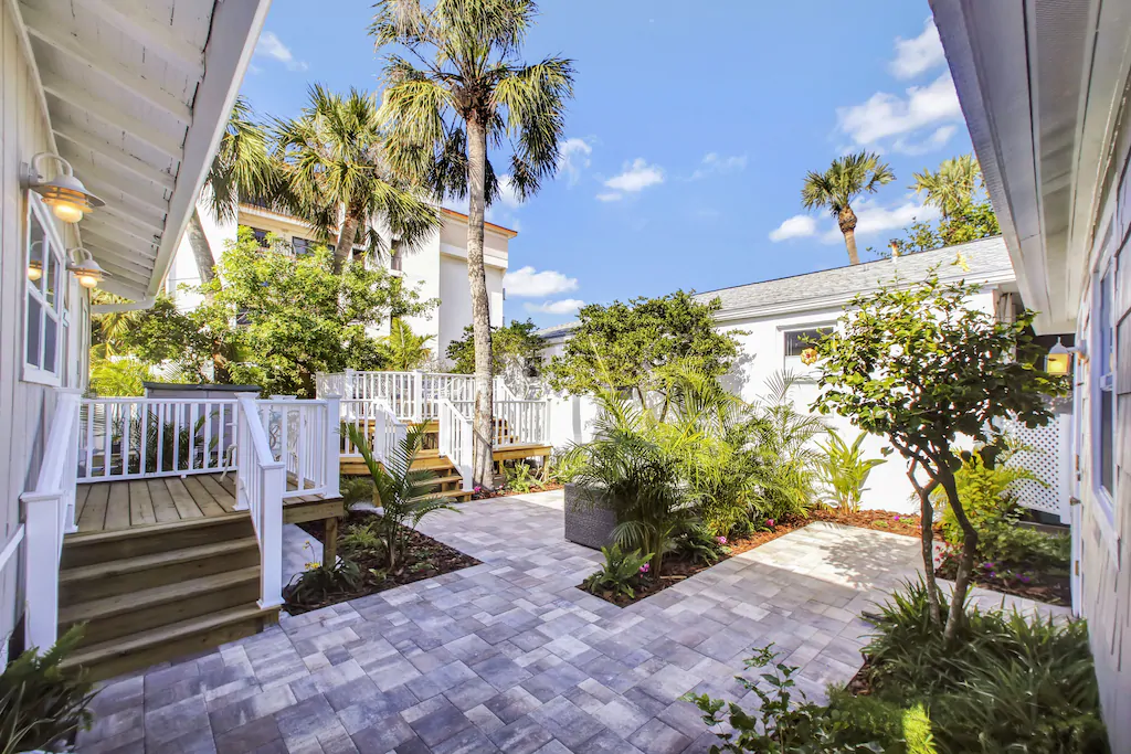 Outside you will find a tropically landscaped courtyard with BBQ grill and soft seating, along with the two-level \"treehouse deck\" providing nice views of the Gulf. The courtyard and deck are shared by guests of the Cottage and Beach Studio, as is the guest laundry room accessed off the deck.