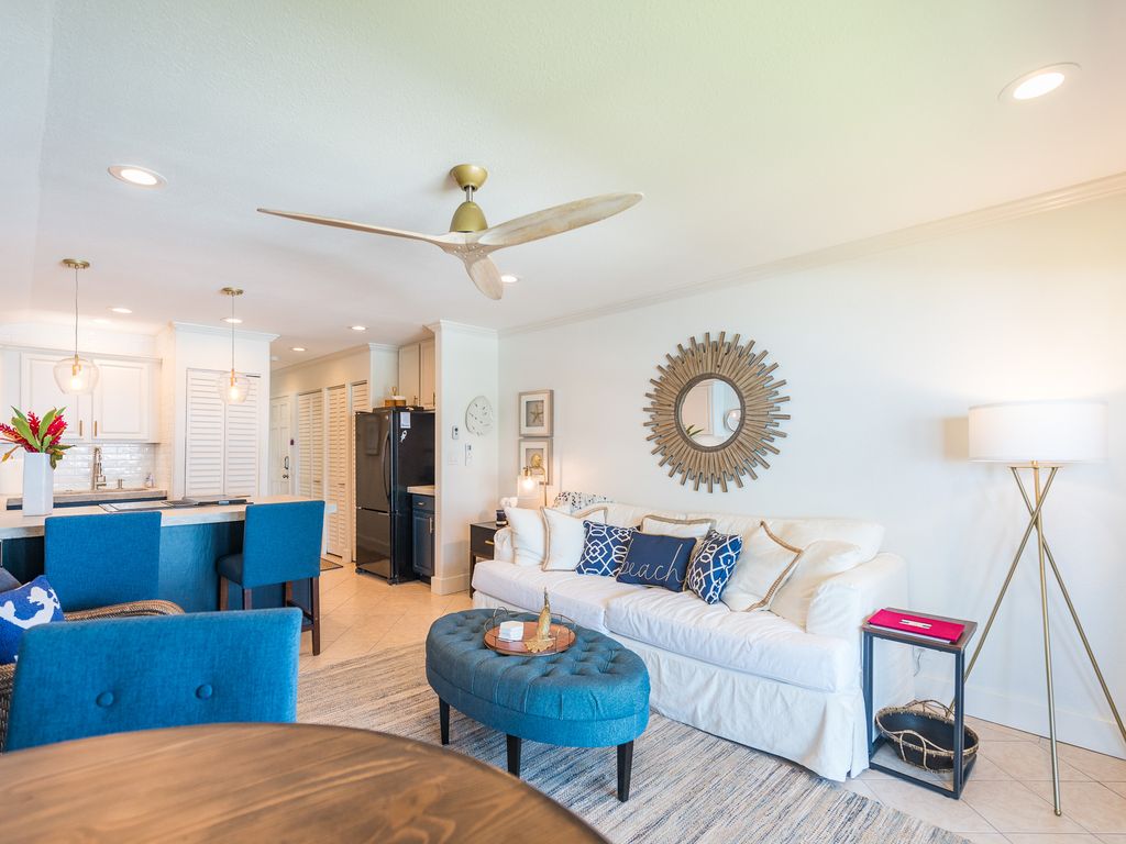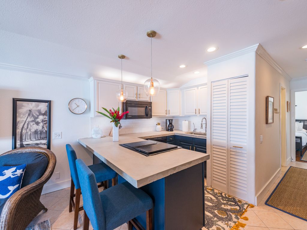 Elegance on a budget! This quiet third floor end unit has spectacular ocean views from throughout the condo. Our air-conditioned condo overlooks beautifully manicured grounds with unobstructed ocean views. The kitchen has concrete countertops and top-end NEW appliances. Our condo offers everything you need to have an enjoyable holiday in paradise. The condo is beautifully furnished. Comfy slipcovered sofa, inside and outside dining. New linens, fluffy towels. Even a set of robes! You can look out to the ocean and mountains while relaxing in the king-size bed. The bathroom has a walk-in shower for easy accessibility. The open kitchen and living room area opens to the lanai. The kitchen is well stocked with everything you might need. A NEW washer and dryer add to the convenience of the unit. There is cable TV in the living room and the bedroom. There is a safe for valuables. Beach towels and snorkeling equipment, cooler and boogie board are provided. Free Wi-Fi is available in the condo.