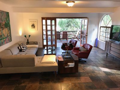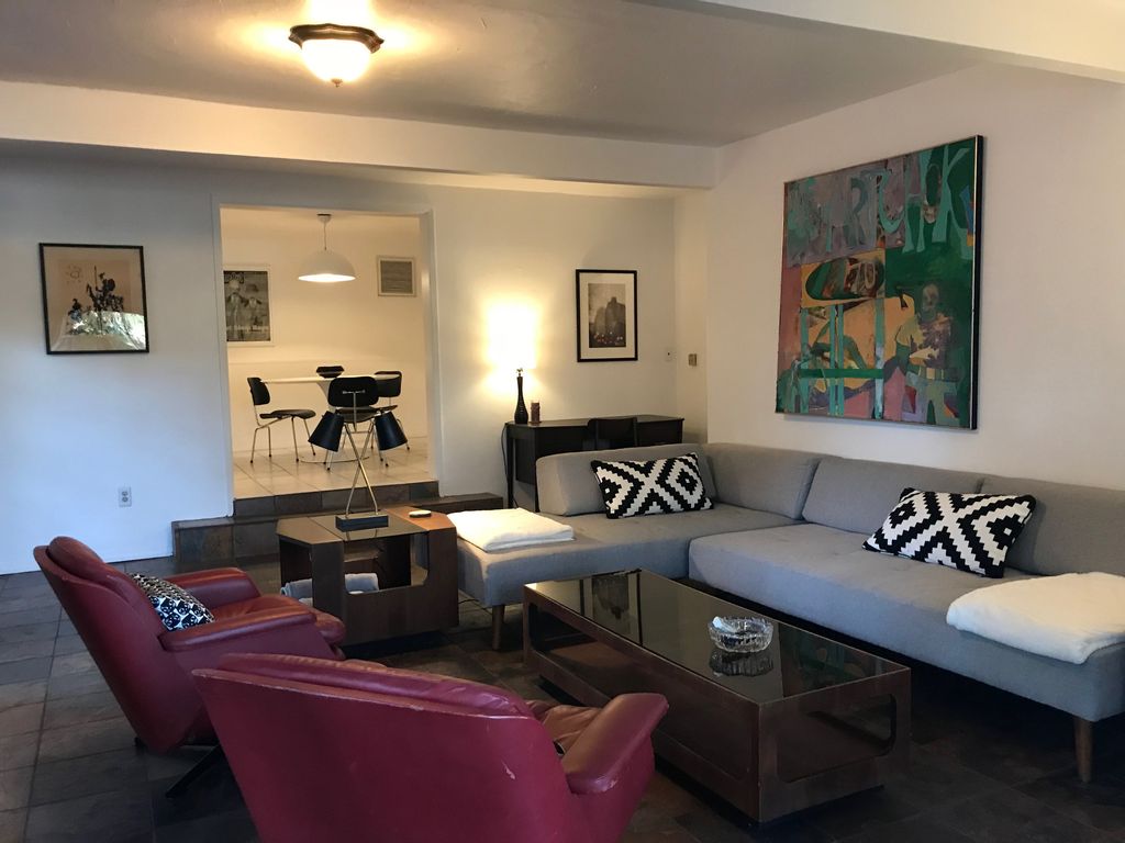 Nice indoor/outdoor feeling with mid-century furniture & contemporary art.