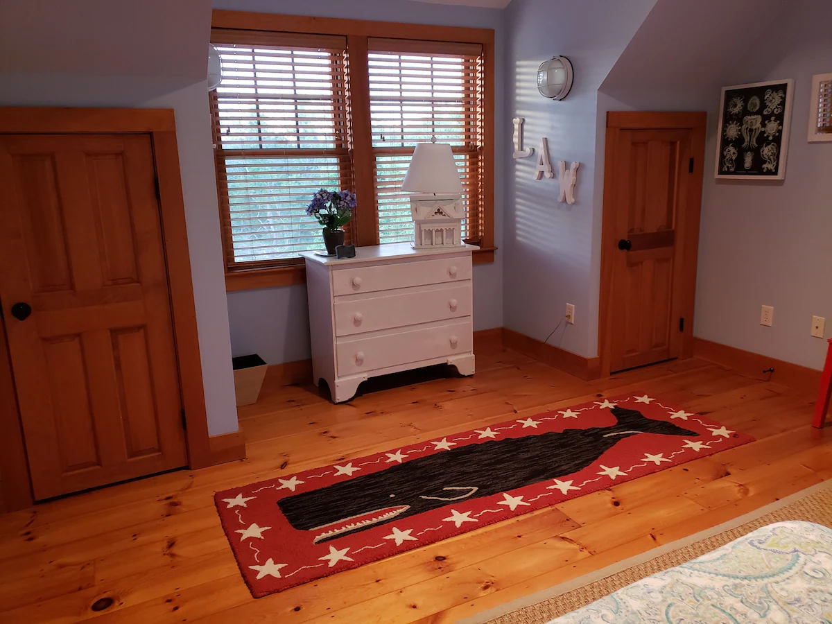 The master suite on this floor has a white-washed wooden vaulted ceiling. This spacious room has a king bed, full bath and large TV, desk, and day bed. There are two additional bedrooms with twin beds and another full bathroom on this floor.