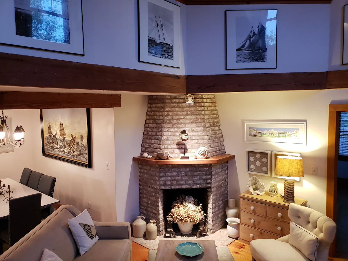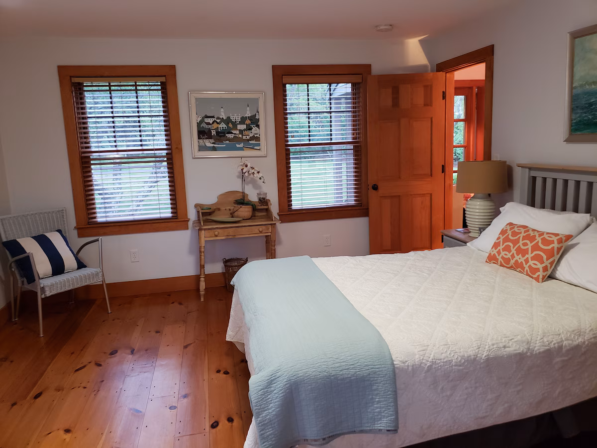 The floors throughout the home are wide pine and stone. There is a first floor bedroom suite with queen bed and full bath. An additional covered front porch in the front of the house has furniture for relaxing and enjoying that morning cup of coffee.