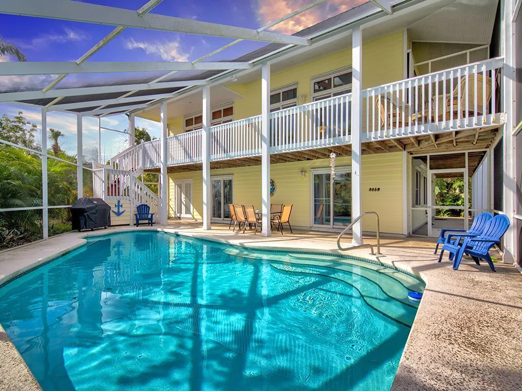 Our Jensen Beach pool home features 3 bedrooms and 3 baths in the main house and 1 bed/1 bath cabana that is located off of the pool area. The home sleeps 10 comfortably and an 11th guest with the use the cot and sheets that are on site. There is a wraparound porch and sliding glass doors throughout the entire home. The cross breeze is incredible!