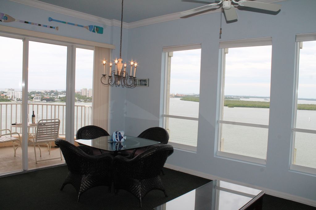 Located on Estero Bay at the southernmost (quiet) end of Fort Myers Beach. Our views are just AWESOME. Across the street is Lovers Key State Park with 2 1/2 miles of white, sugar-sand beaches. Enjoy shelling, bird watching, fishing, people-watching, as you stroll the beach. Fantastic waterfront restaurants and lounges, including Flippers located in this complex, are prevalent in this area. Romantic sunsets can be enjoyed right off your own private balcony. Many amenities are offered by the Resort, including a wandering geo-thermal pool with waterfall, hot tub, exercise facility, outdoor gas grills, computer room, restaurant/bar, self-serve laundry facilities. Kayaking, fishing charters, jet-ski rentals, boat rentals, parasailing, golf courses, scuba and snorkeling charters, and shopping centers are all located within convenient proximity. From our Lovers Key Penthouse, the water views are magnificent. See dolphins, manatees, and sea turtles swim past as you view them from your room. You have a birds-eye view of the pelicans flying by and dive-fishing. This unit was totally remodeled. It is the largest unit in the complex and has coved ceilings, granite kitchen counters, all new appliances, 2 flat-screen tvs, king-size bed, Jacuzzi tub with large separate shower. We selected a very comfortable sofa with both ends reclining, instead of an uncomfortable sofabed. Free wireless internet is also available in this unit.