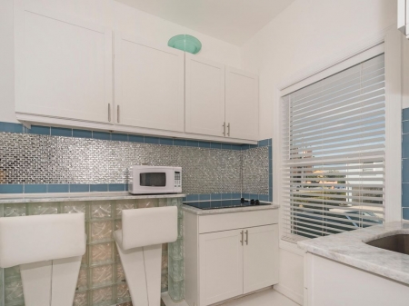 This posh place is appointed with all of the modern and necessary appurtenances- stainless steel refrigerator, stove, microwave, coffee machine, pots, pans, new plumbing fixtures, sinks, faucets and granite counter tops.