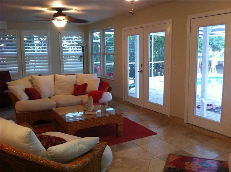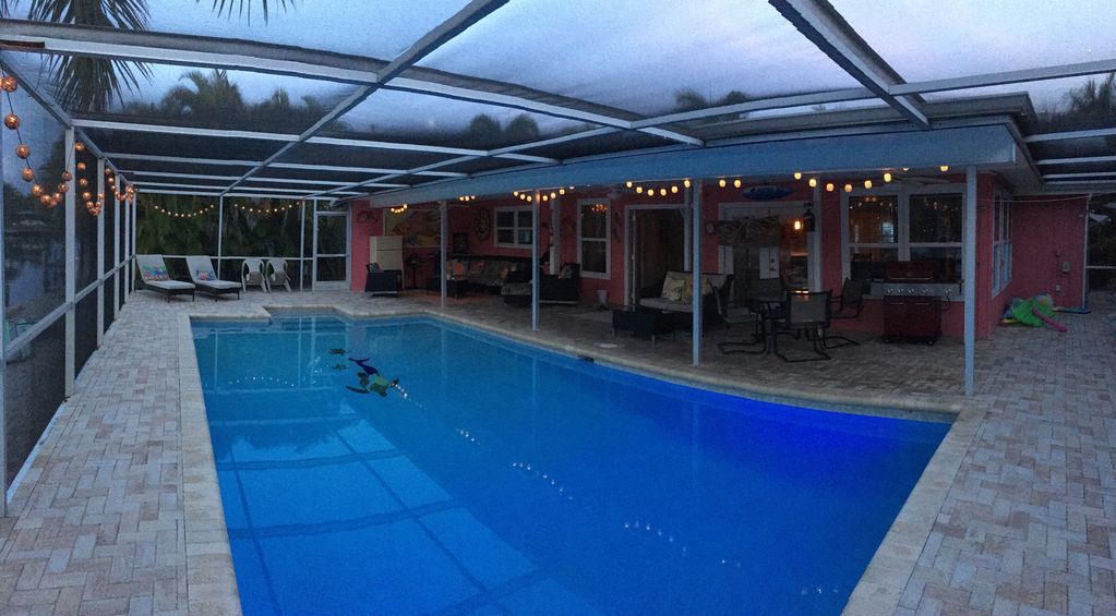 2000 square foot home that has been completely renovated beautifully. Large screened in pool (15x30) with lanai that has lots of outdoor seating and lounges for tanning. A dock on the canal the you can fish off of. All new appliances including washer/dryer. 3 bedrooms and 2 baths, 2 TVs with cable & wifi. Close to shops and restaurants. A short walk to the beach and house is located on a wide canal to watch the occasional dolphin or manatee.