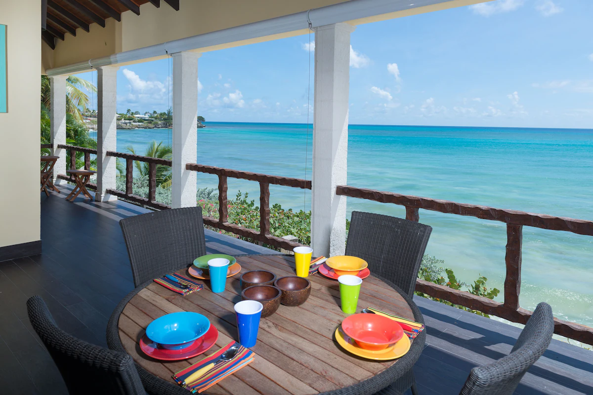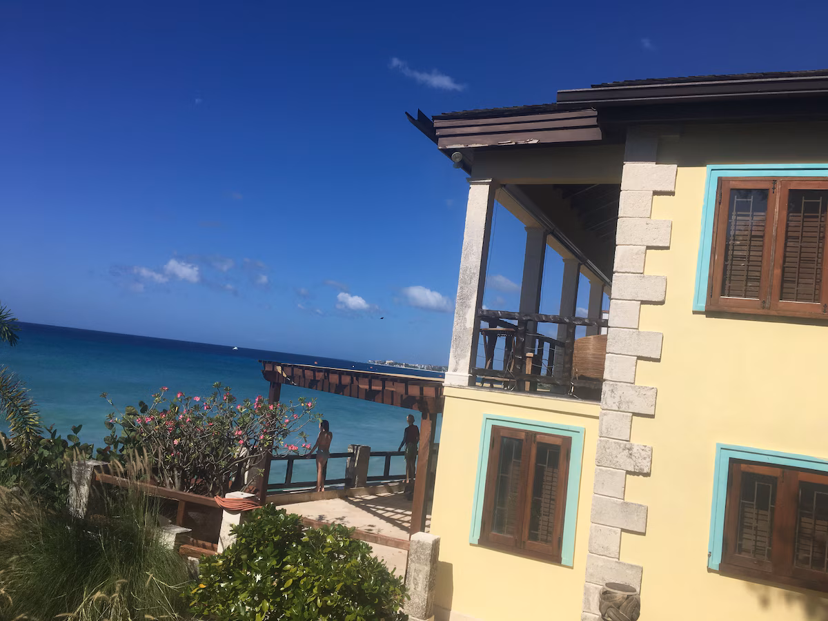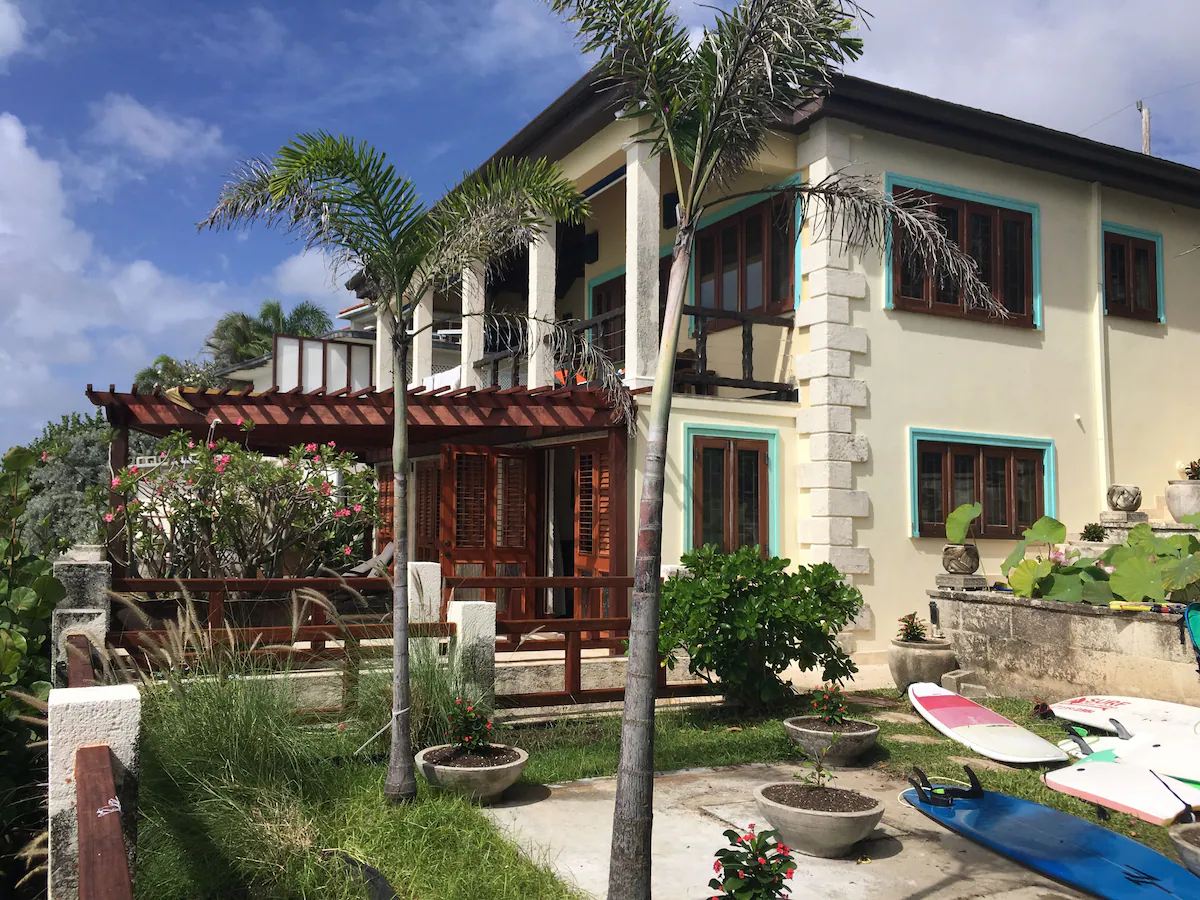 A stunning villa right on Freights bay with direct beach access from the terraced garden. A surfers paradise you will not want to leave with incredible views over the bay. Sleeping up to a max of 10 guests in beautiful air conditioned double bedrooms, 3 of which overlook the turquoise ocean. Wake up to spot turtles with breakfast on the balcony, watch the surfers who begin appearing at dawn or join them. Sit in the plunge pool and enjoy the sunset over the water. The open living area with the gentle tradewinds blowing through the dark wood and coral bricks allow you to enjoy the glorious tropical temperatures.