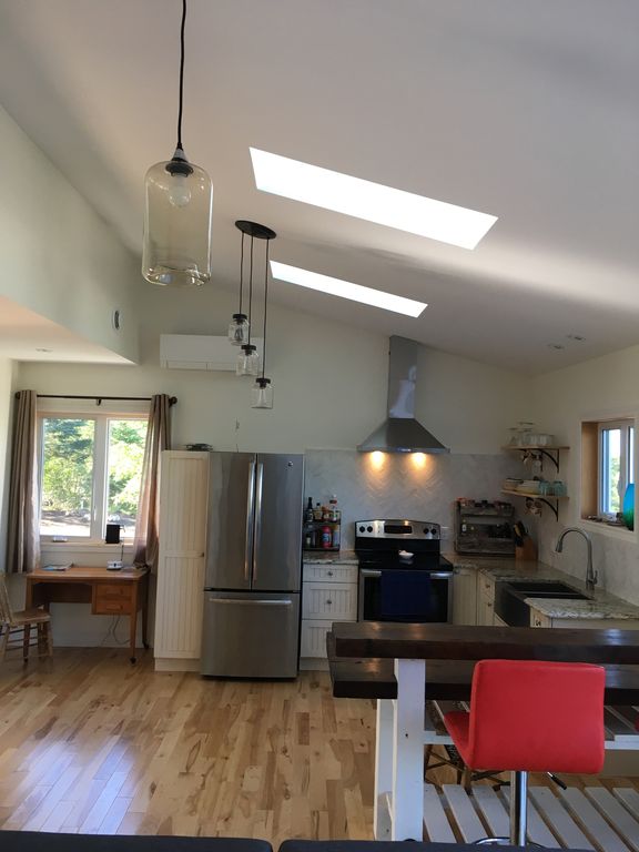 2 acre lot with beautiful views, deck and fire pit. This 3 bedroom home with amazing entertaining space is perfect for family vacation or working away with special winter and long term rates. Enjoy Nova Scotian salt air, culture and waking up to bold sea views.. Enjoy wild blueberries, raspberries, blackberries and wildlife in spring and summer plus enjoy cross country skiing, snowshoeing and ice skating on the pond in the winter. Lot is next to old CNN rails great for hikes, bike rides and is a new build house and very comfortable. (Family friendly) landscaping will be dont in fall 2017