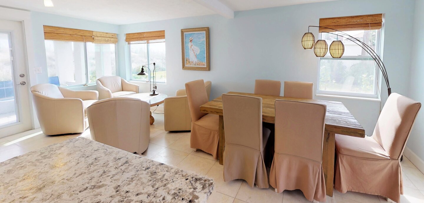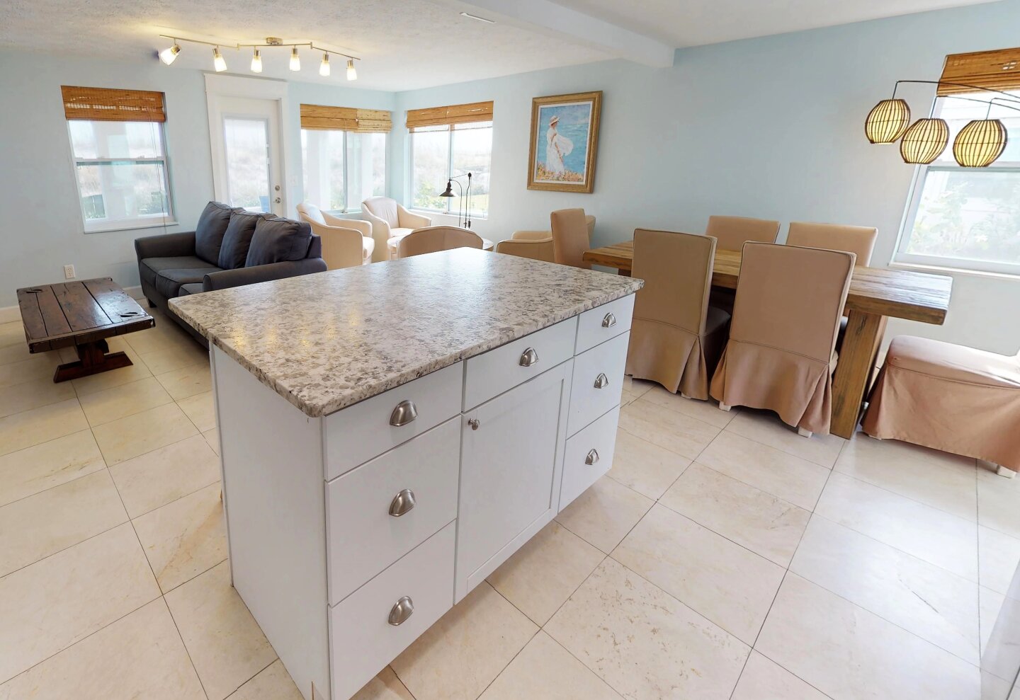 OPEN GREAT ROOM - Inside features the new "Open" central room with Kitchen, Living and Dining all in one. The BIG SCREEN TV comes with Comcast Cable plus a Streaming Video box for sharing You Tube Videos or Netflix favorites (if you have an account). FREE WIFI. The sofa converts to a Queen Sleeper if you need more sleeping arrangements. And the Floors. They are all Marble. So soft and cool. We loved them so much we used it throughout the house, even on the Lanai.