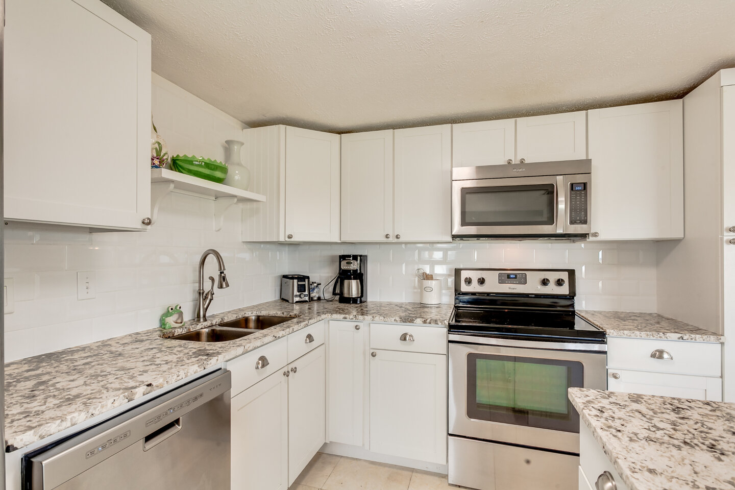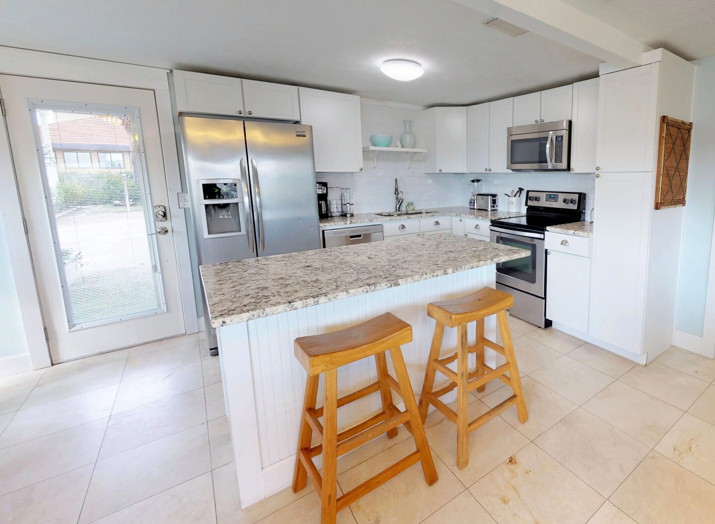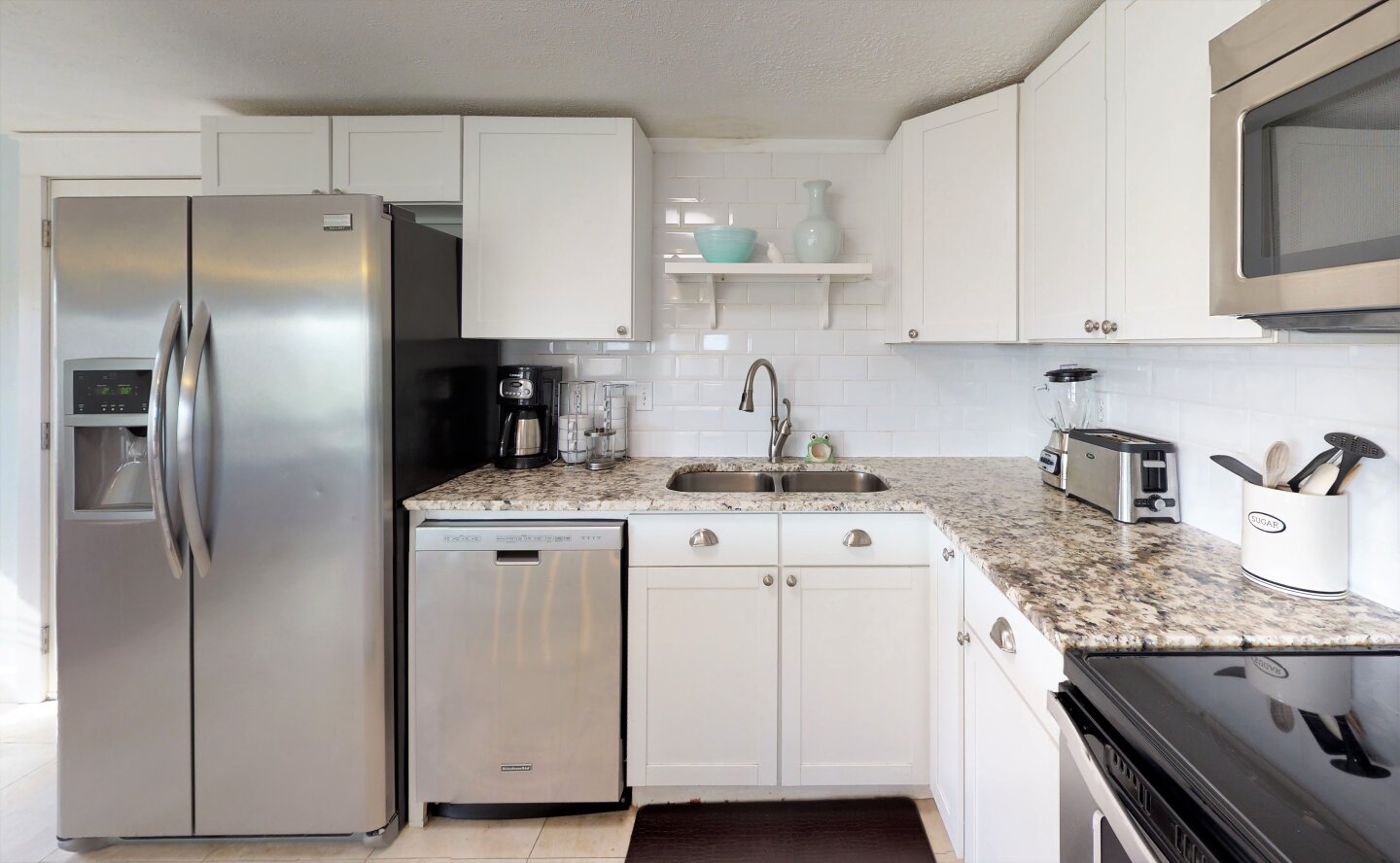 GOURMET KITCHEN - White Shaker Cabinets, Stainless Appliances, and a new "Leather Finish" Granite Counters and Island. Very different. I fell in love the moment I saw it. There is a HUGE Gathering Island with Bar Stools where you will spend most of your time. Comes fully equipped with Pottery Barn dishes and glasses and all the Pots and Pans you will need to prepare gourmet meals. I hope it will inspire you to stay home and cook. You may save enough to stay another day. That's one advantage of a Home vs a Hotel! So bring your favorite Family Recipes!