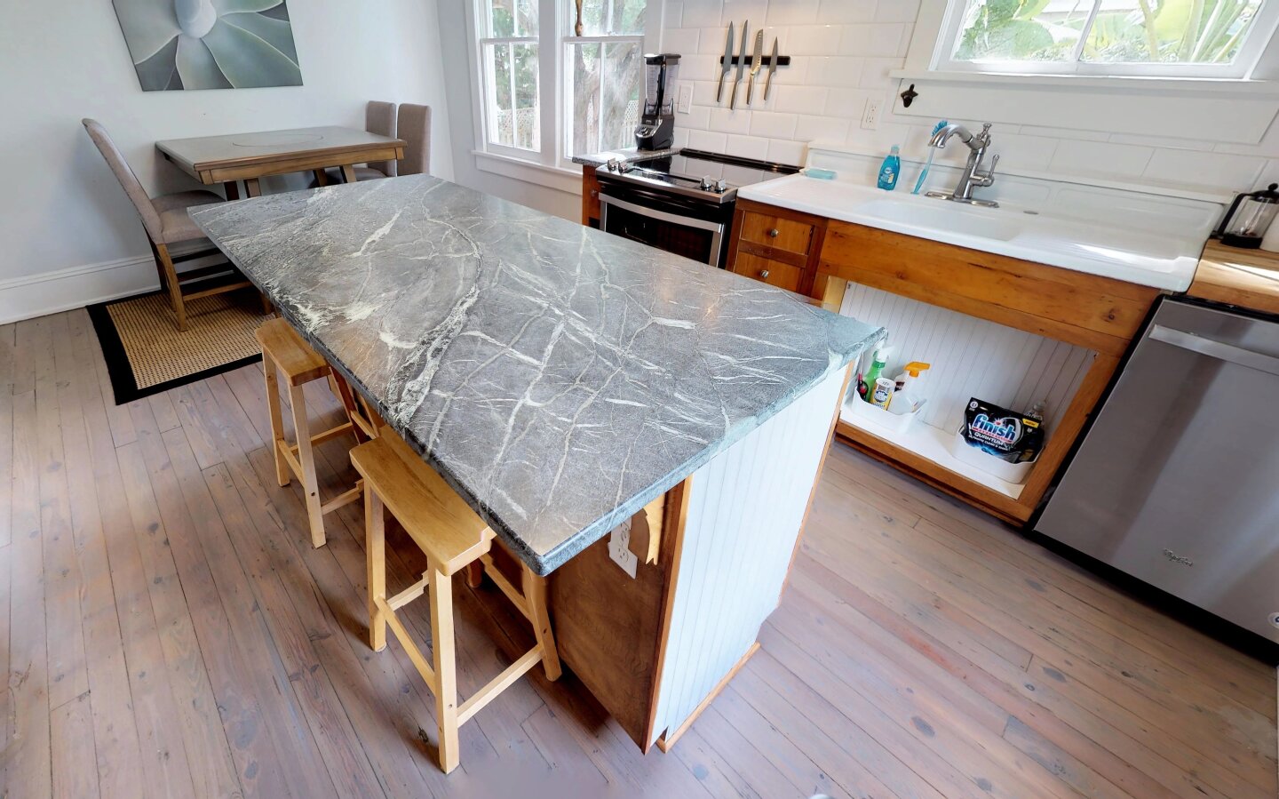 The Kitchen is from my old Homestead in Tennessee. The cabinets are Poplar. They were originally built over 50 years ago and even at that time the wood was antique. Supposedly these Poplars died out long ago and you cannot buy the wood any more. My Father found it when they were tearing down an old Elementary School in my home town of Shelbyville Tennessee (Walking Horse Capital of the World if you have heard of us). I always loved them as a child. So when I heard they were tearing down my homestead I had to save them. I have spent hours restoring them. I hope you will appreciate them and an Old Farm Sink which I salvaged. The is a New SOAP STONE Counter Island for extra seating and a Handmade Butcher Block Coffee Bar. New Stainless Appliances. Lovingly White Washed Pine Ceiling. Unique Dining Table with Lazy Susan + another Revolving Fan.