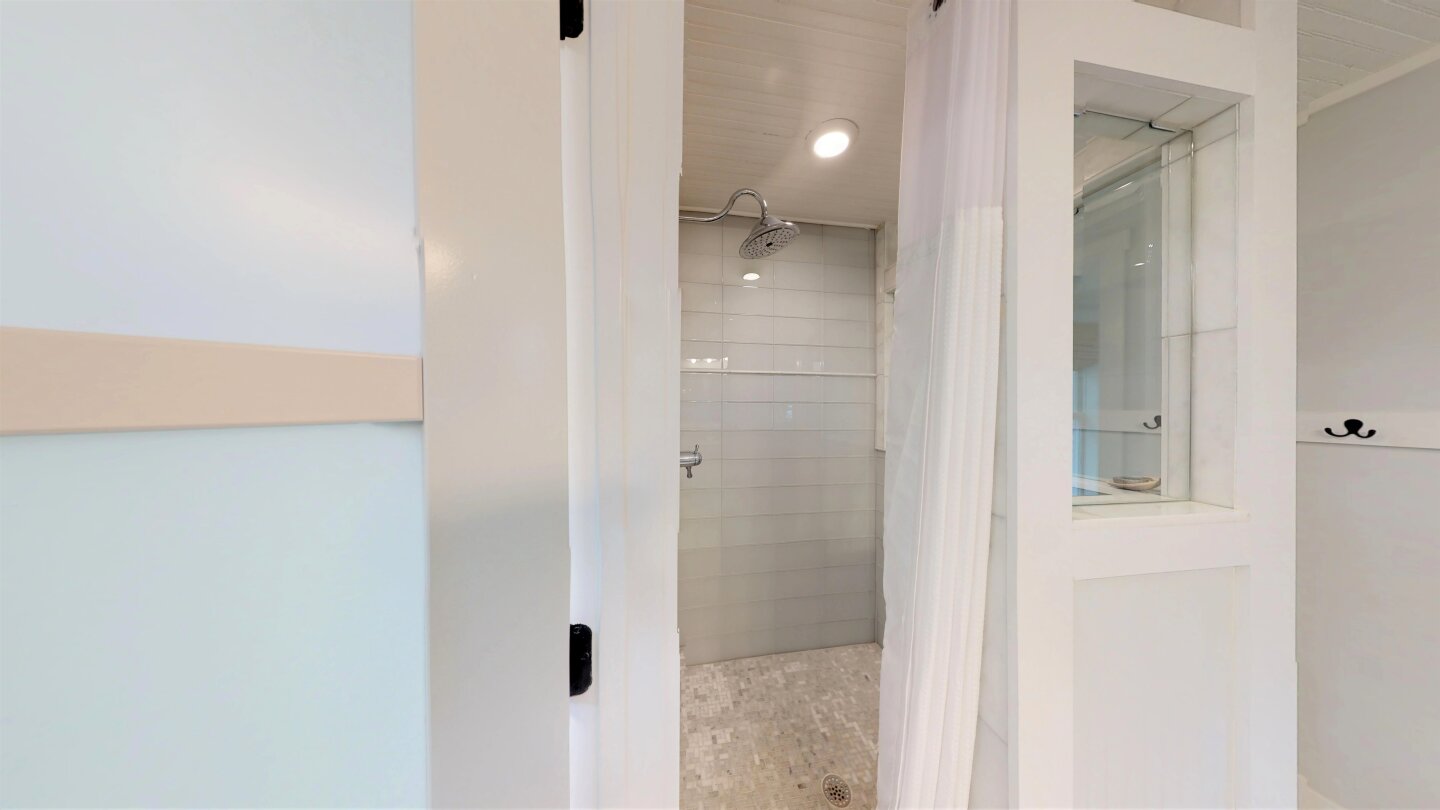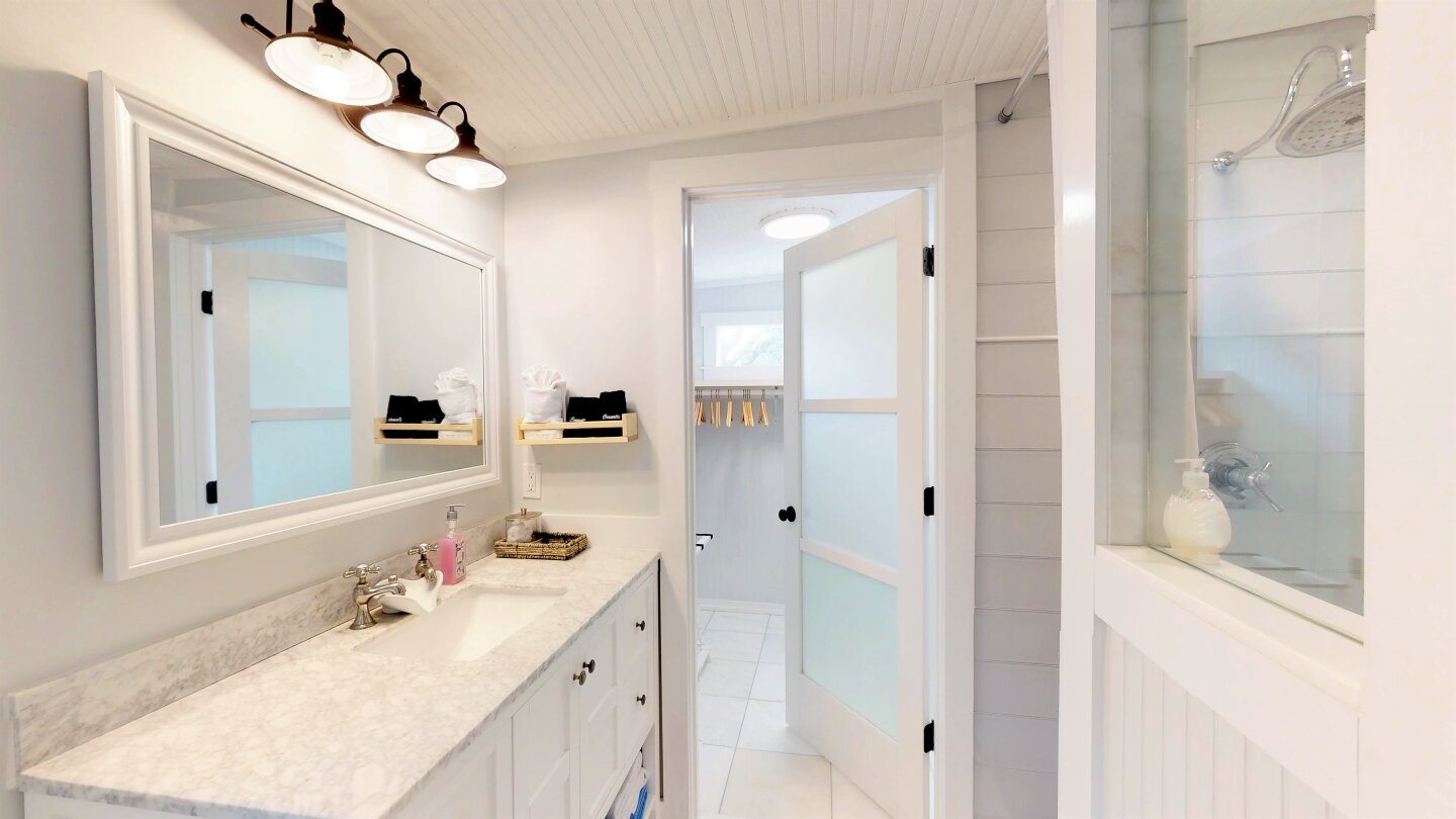 There is a Half Bath in the Greatroom for Guests and a Huge Master Bedroom with Private Marble Bath, of course a King Bed plus a roll-out Single Trundle. Great for a "Little One". There is also a giant Walk-in Closet with room for Pack N Play. You will recognize my beloved Glass Spa Doors like upstairs and this time a Marble & Glass Shower with removable Hand-Held Shower Head. The Vanity is Marble with Twin Sinks and loads of hooks.