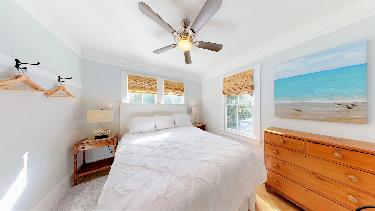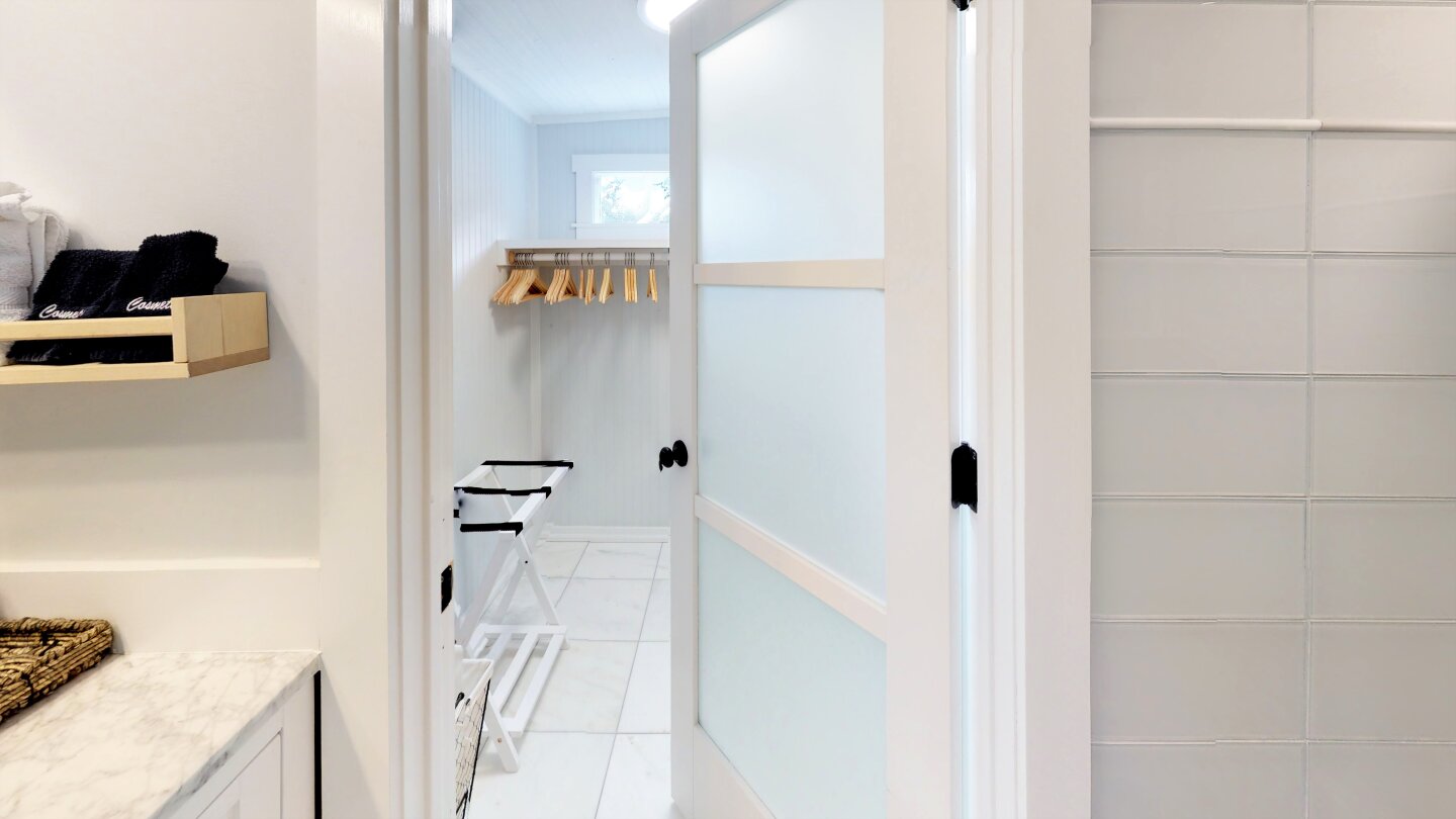 The Master with Private Bath was originally a Sleeping Porch. I enclosed it, raised it and added Light Pine Floors. It has a King Bed + a Fold-down Sofa for extra Sleeping or relaxing. The Bath is all Marble Floors and Glass. I fell in love with the Spa Glass Doors and used them to the Bath and Closet and carried the Glass look into the Shower with floor to ceiling Subway Glass Tiles. The Vanity is Marble topped with unique retro Faucet. There is large Marble floor Closet with room for a Pack-N-Play, available upon request.