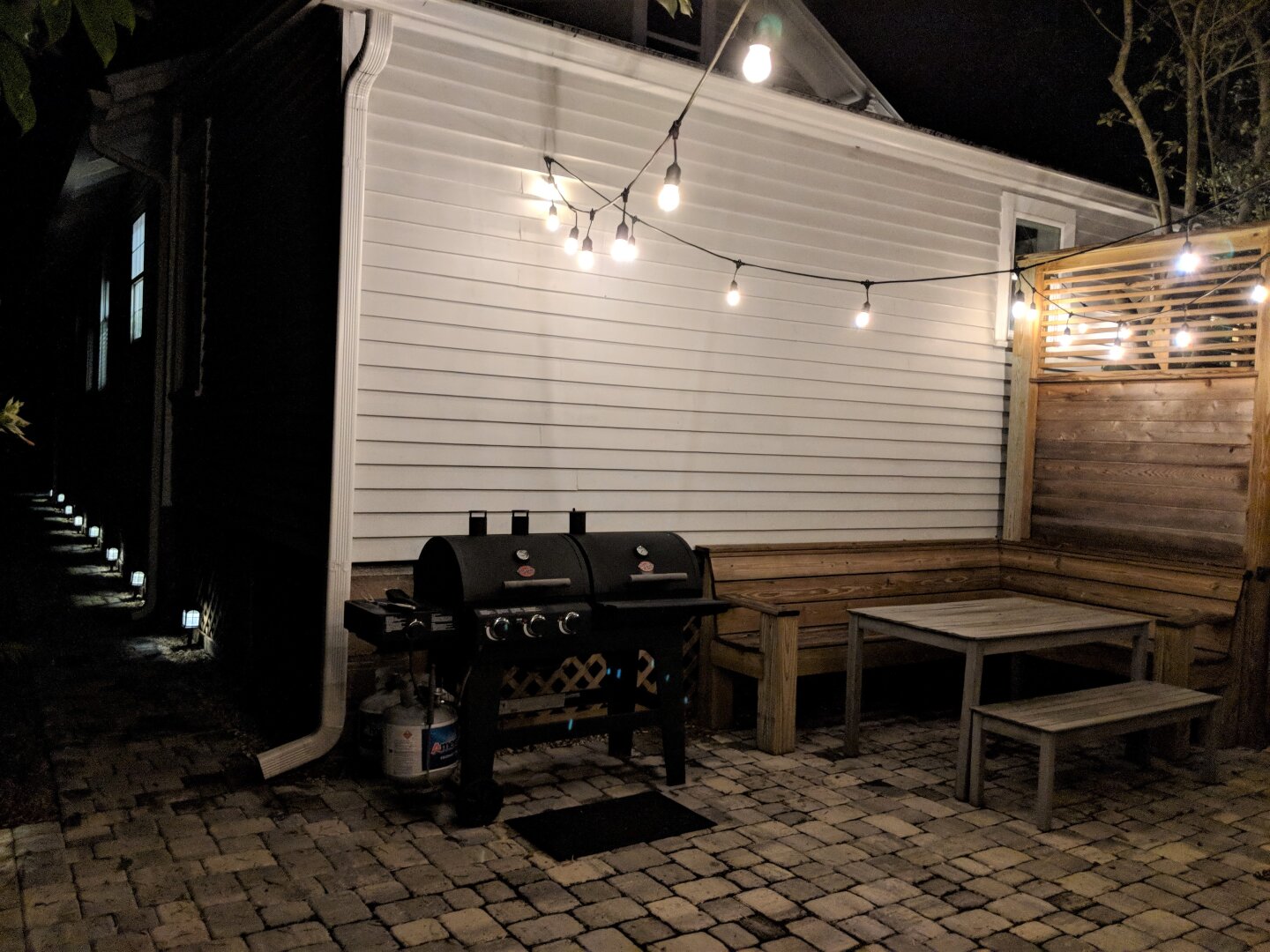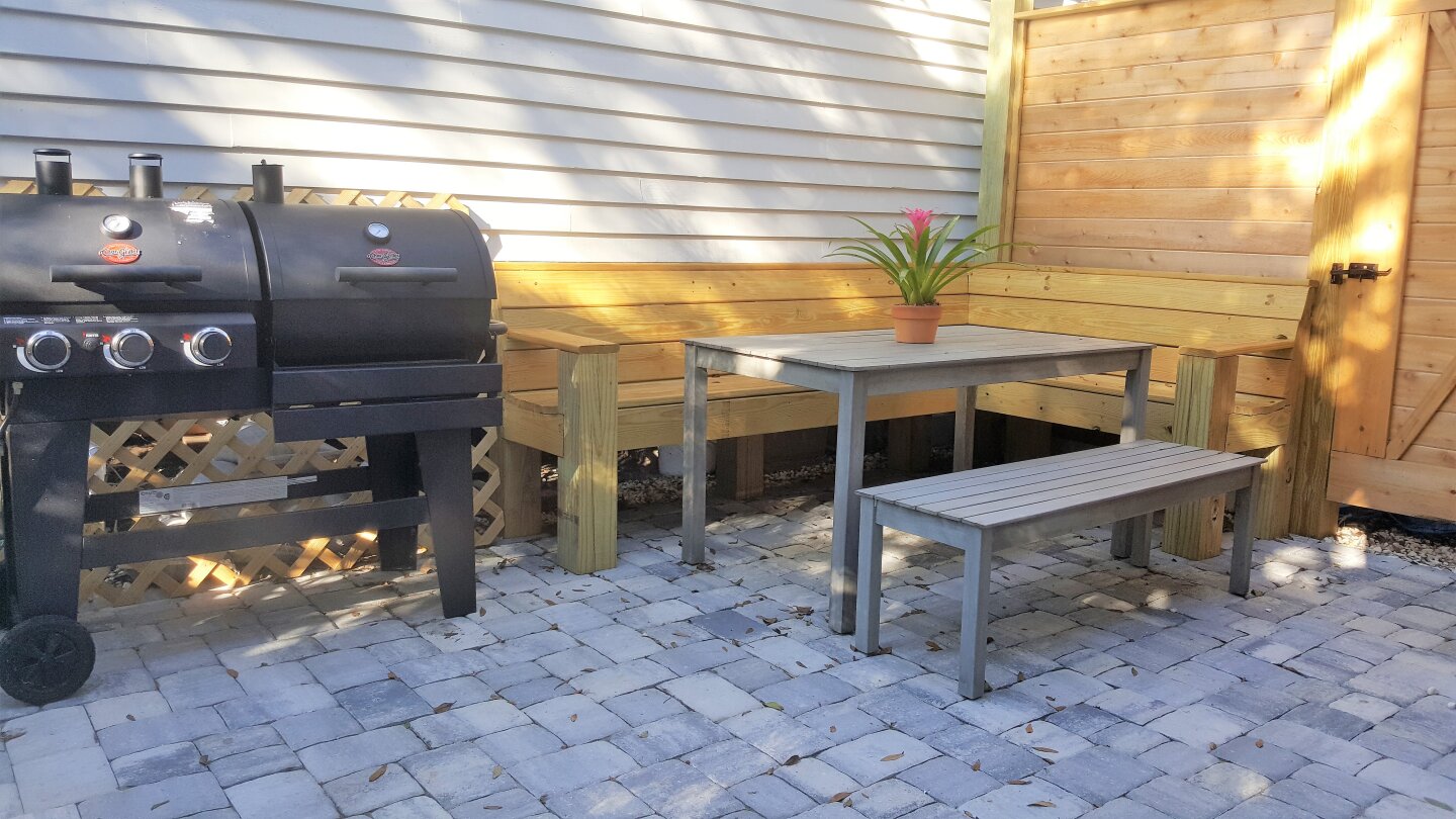 Outside is a private Paver Patio with Dining and romantic String Lights overhead. The Grill that can go Gas or Charcoal. And we provide Beach Chairs, Towels and Boogie Boards.