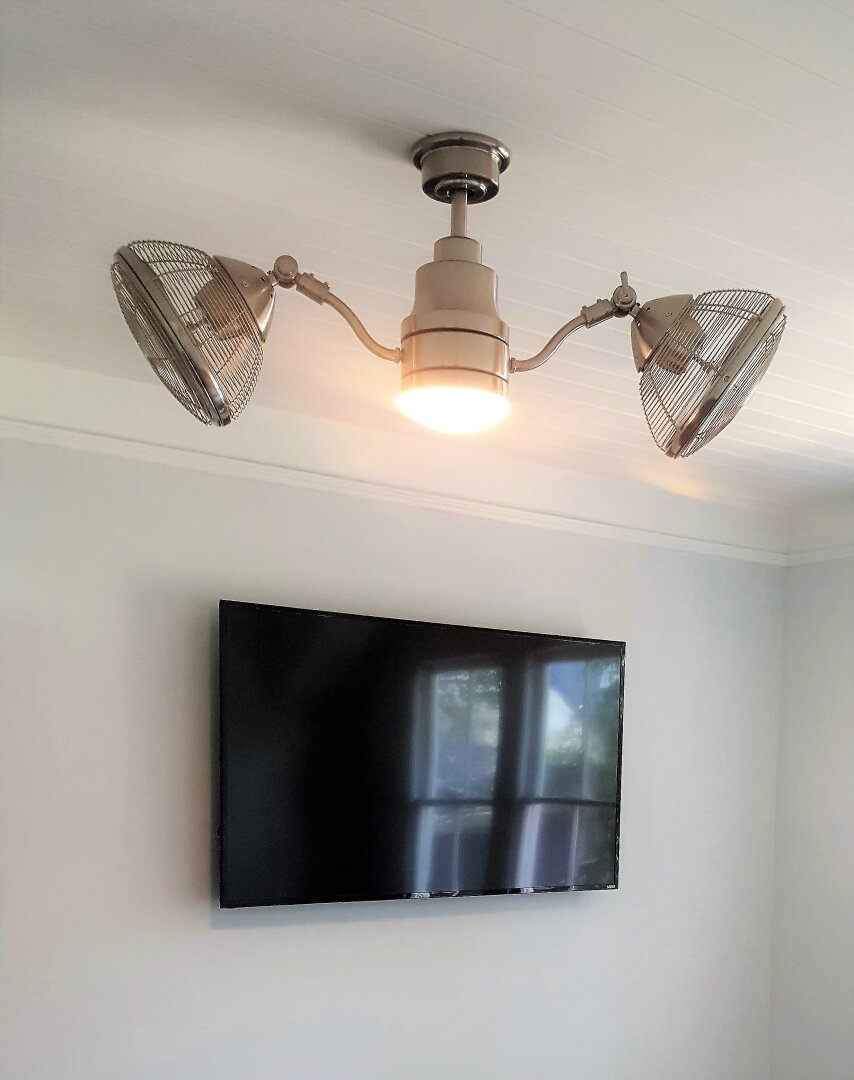 The Great room with Large Smart TV (4 TVs in all) has plenty of seating with a Leather Queen Sleeper Sofa + Love Seat & 2 Swivel Chairs. It features a unique 2 Headed Revolving Fan you will love and gorgeous original gray hand stained Heart Of Pine Floors.