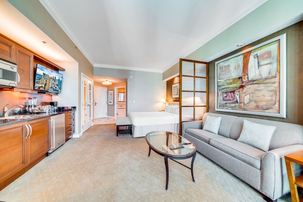 Step inside your 550-square-foot suite and immerse yourself in elegance. Enjoy a dedicated sitting area with state-of-the-art entertainment technology, full kitchenette, king-sized bed with upscale linens, and a rejuvenating whirlpool spa tub.