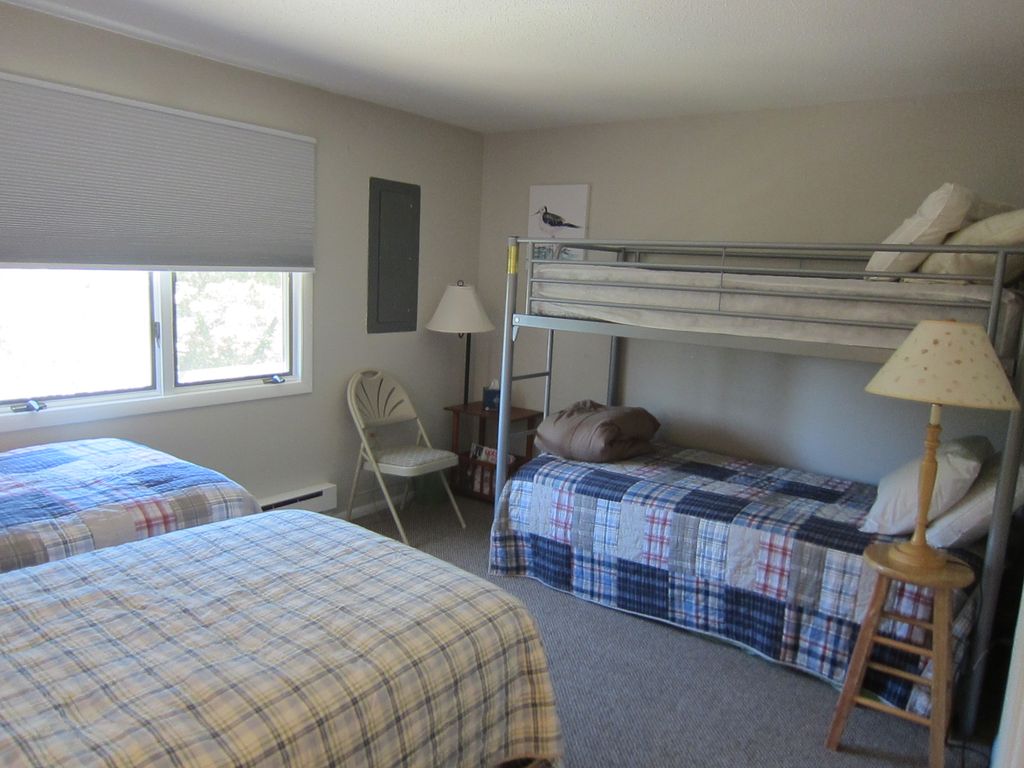 The master bedroom has a king size bed and its own private bathroom. In each of the other two bedrooms, there is a bunk bed and two twin beds.