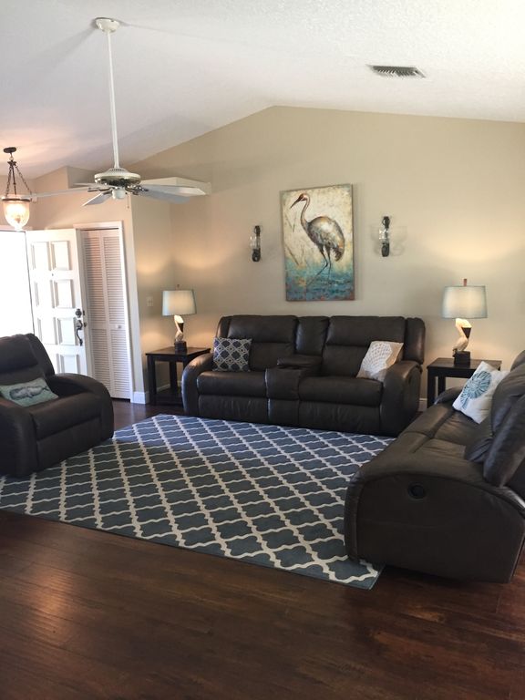 Come and visit the Sunshine House! Wonderfully decorated home with 3 bedrooms, 2 full bathrooms and beautiful blue inground HEATED swimming pool with child fence. Sit and relax on the outside covered and screened lanai with table, chairs, patio furniture, ceiling fans and mini fridge. Master bedroom has a king sized bed with pillow top mattress, walk-in closet, desk, tv and private sliders to the pool. Master bathroom has a double vanity with double sink and a walk-in shower. Living room has 50” flat screen tv, a dining / seating area and a triple slider that opens super wide to the pool. Home also has free wi-fi and Directv.