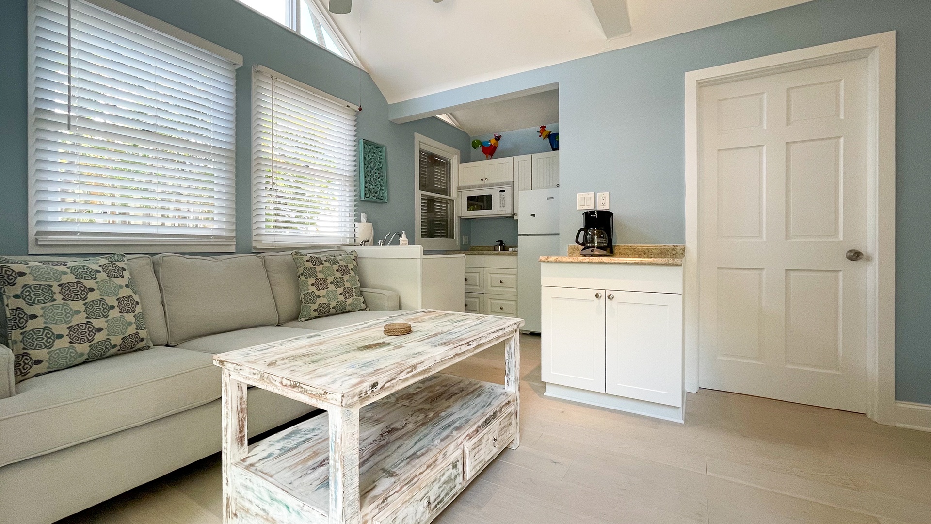 This charming suite is comfortably furnished with a queen bed, comfortable couch, flat-screen TV, and tropical artwork. An open floor plan creates a breezy atmosphere and the kitchenette features a coffee maker, microwave oven, stovetop, refrigerator, and the accessories to allow for small meal preparation if you aren\'t up for going out. A spacious bathroom with standing shower and full-length mirror completes this wonderful accommodation. The french doors lead out to an inviting deck close to the shared pool.