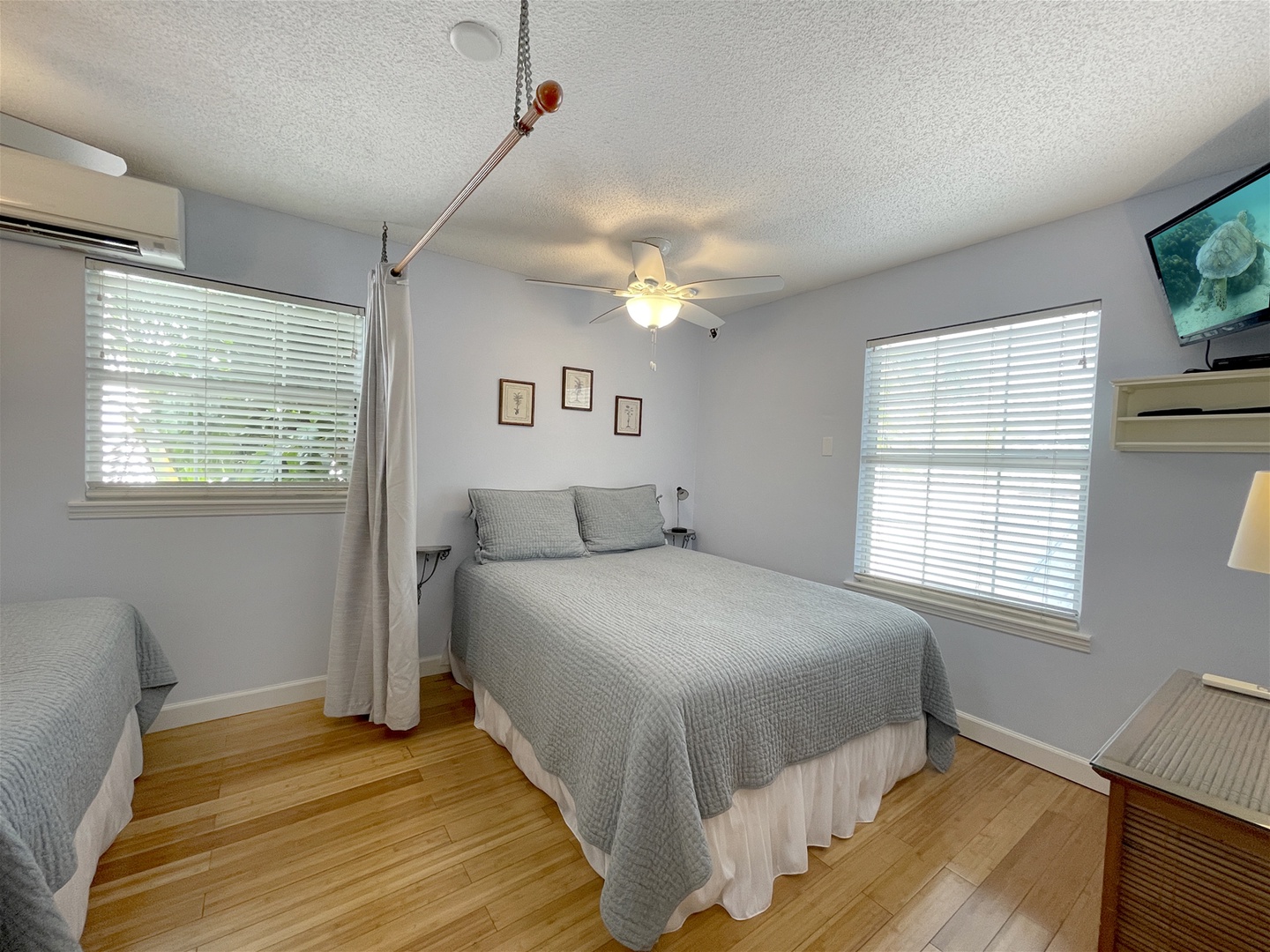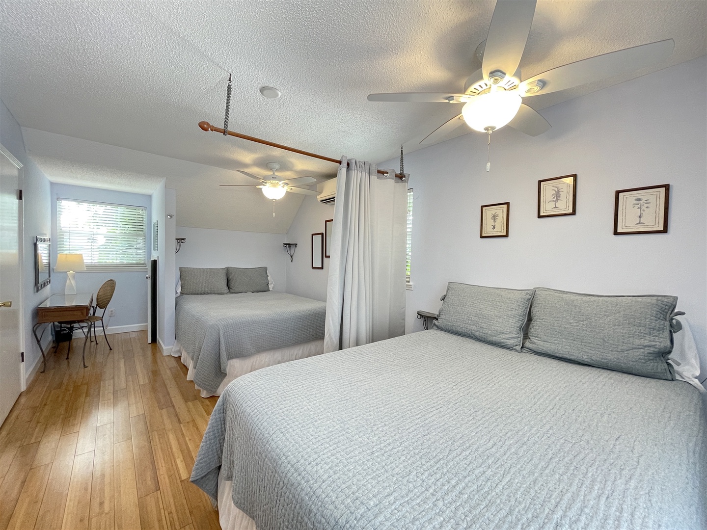 The Bonaire Suite is a bi-level suite decorated in a rich contemporary palm tree motif with two queen beds separated by a privacy curtain in the upstairs bedroom. The upstairs bath features a custom tumbled marble shower with glass door.