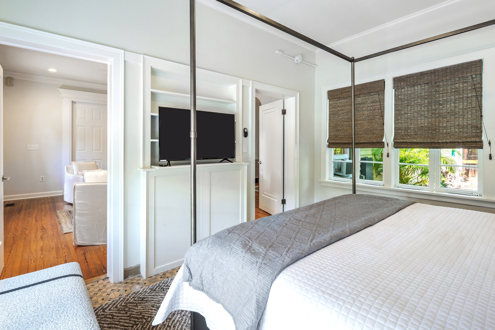 The New Orleans themed bedroom has a four poster queen bed. The bathroom is ensuite and has a tub/ shower combo with a dramatic high tiled archway above. The original solarium is home to a unique bedroom with Cuban tile floors and an ample king bed. The bathroom is nearby and has a tiled walk-in shower.