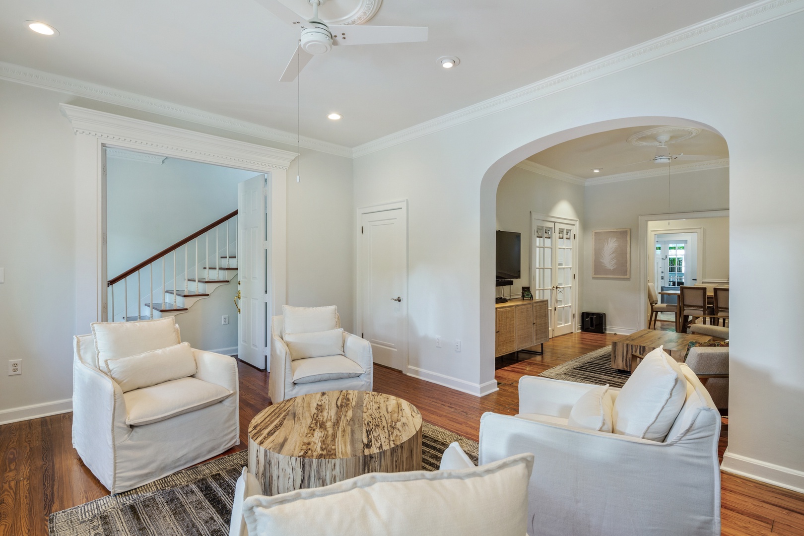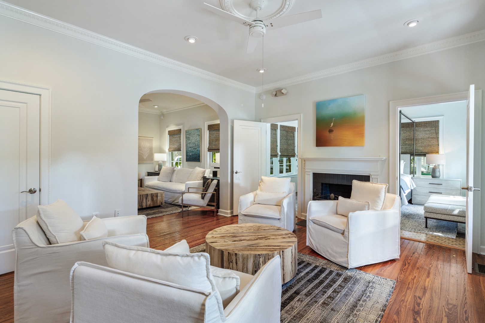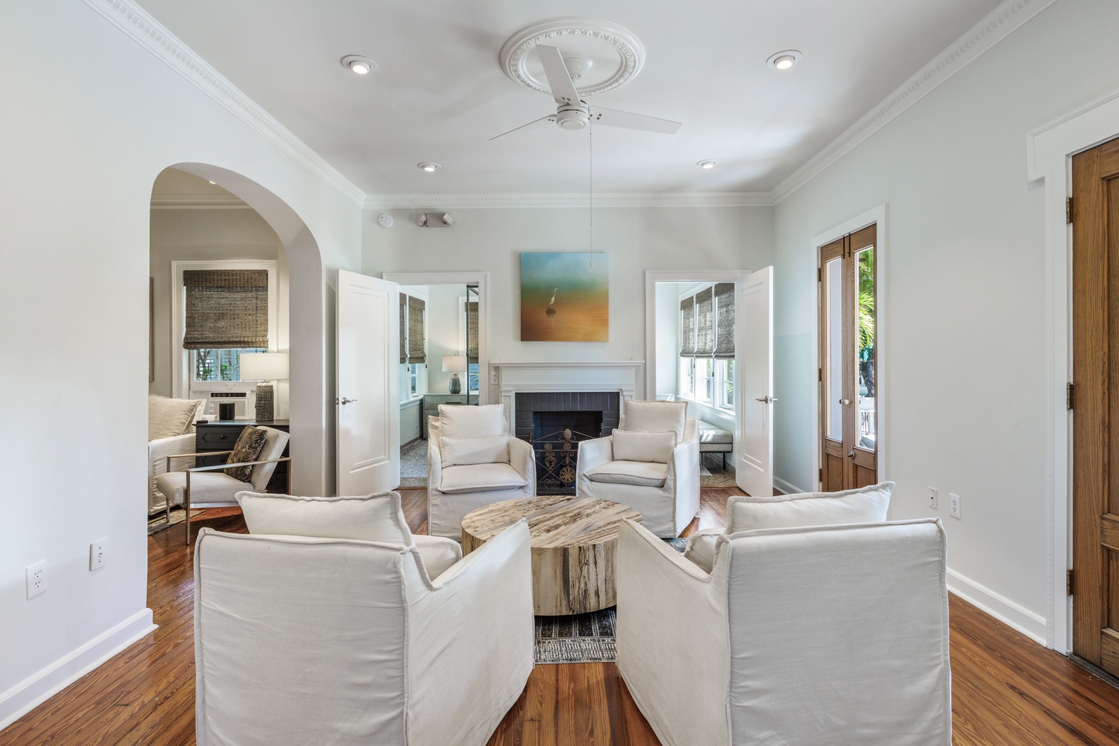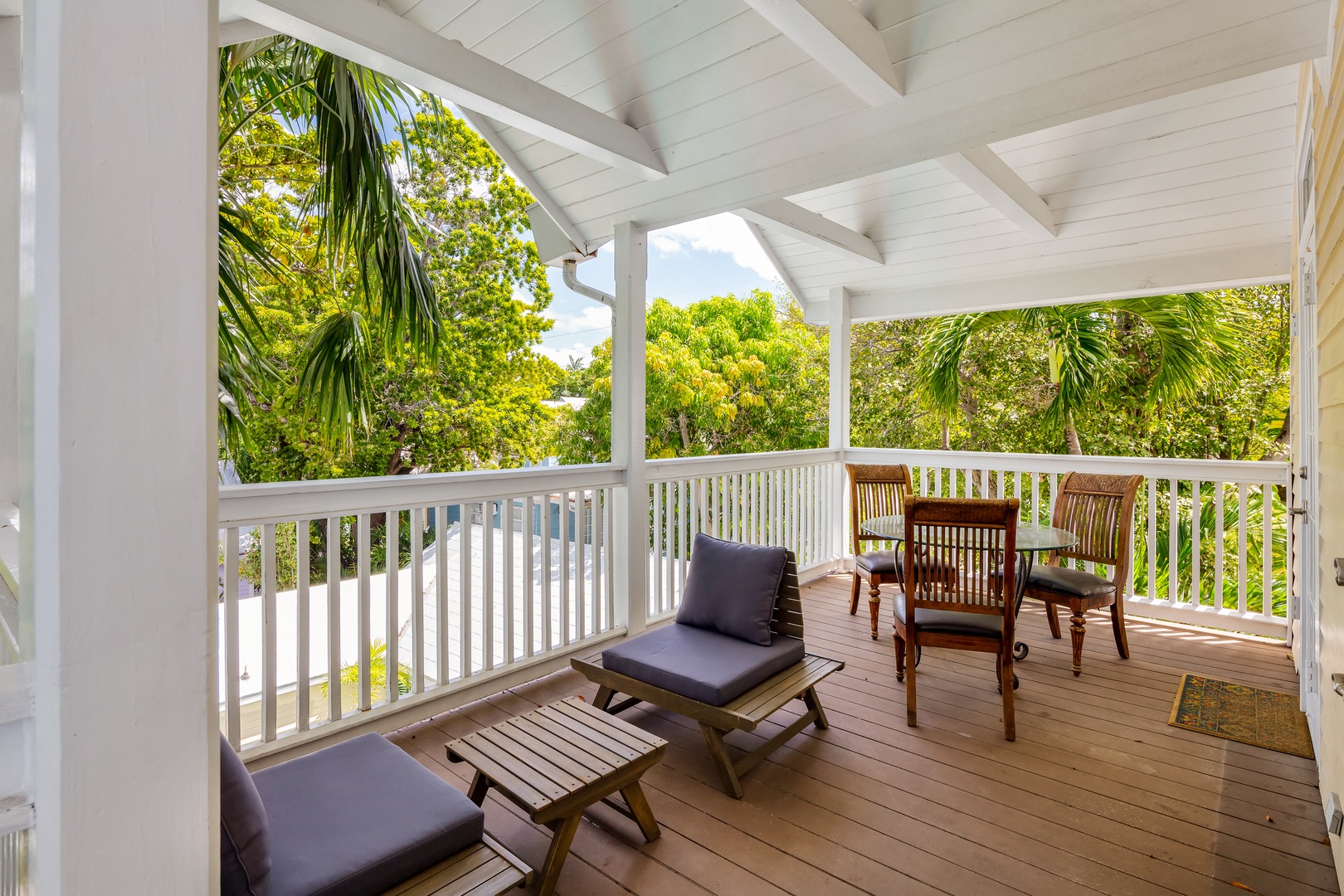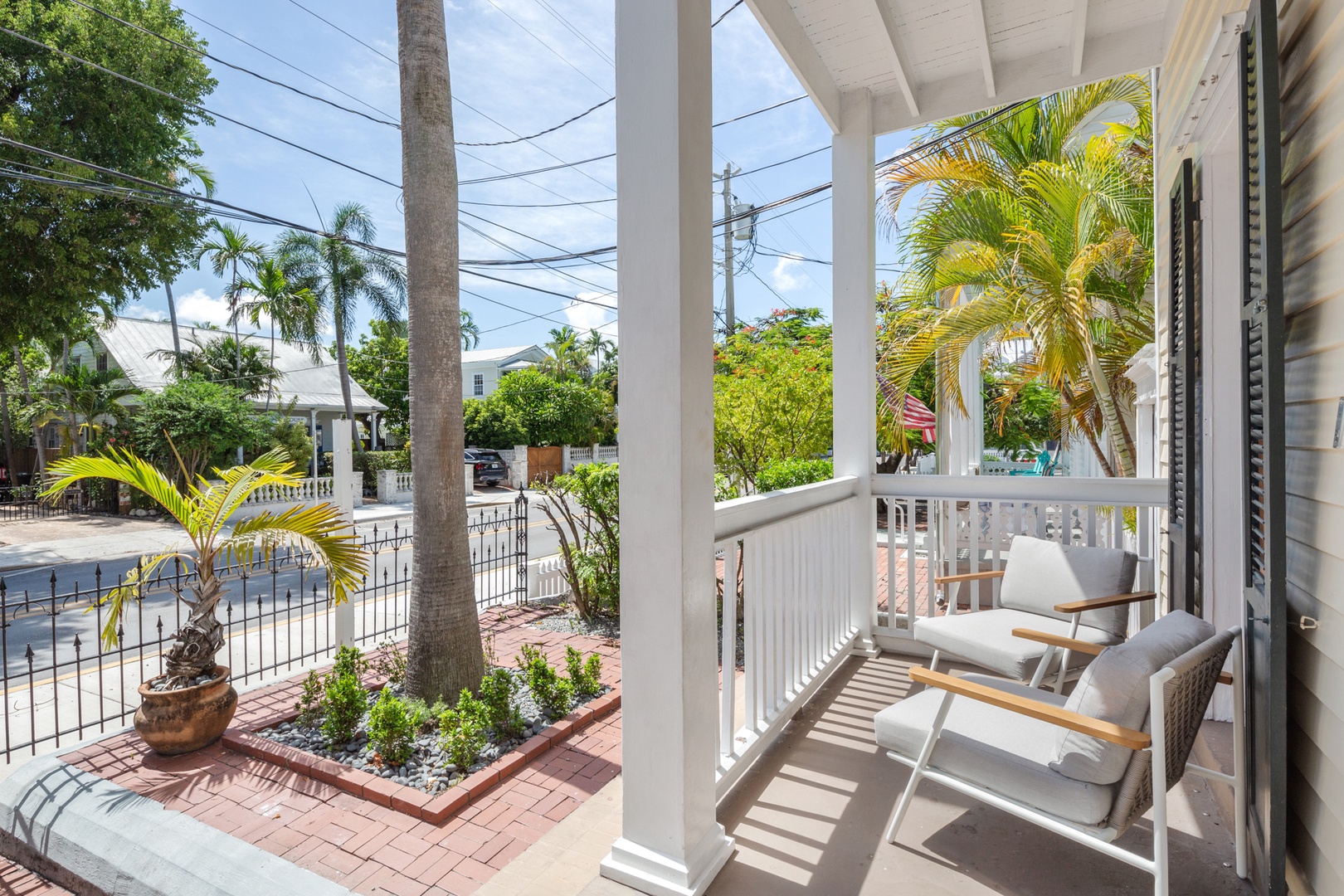 The banister from the 1890’s and beautiful chandelier guide you up the staircase to the 4 bedrooms and 4 bathrooms on the 2nd floor. The front bedroom has a queen bed and French doors leading to the balcony that spans the width of the house and offers a view of the historic streetscape below. The ensuite bathroom is finished in tile and has a walk-in shower. The west bedroom offers a pencil-style four poster queen bed. The room has original Dade County Pine wood planked floors and large windows. The bathroom is ensuite with a tiled walk-in shower. The east bedroom contains a king bed and features island style wicker furnishings. The ensuite bathroom has a tiled walk-in shower. The back bedroom has a modern aesthetic with a king bed and two sets of French doors leading to the balcony overlooking the outdoor living space and pool. The ensuite bathroom has double sinks and a tiled walk-in shower.